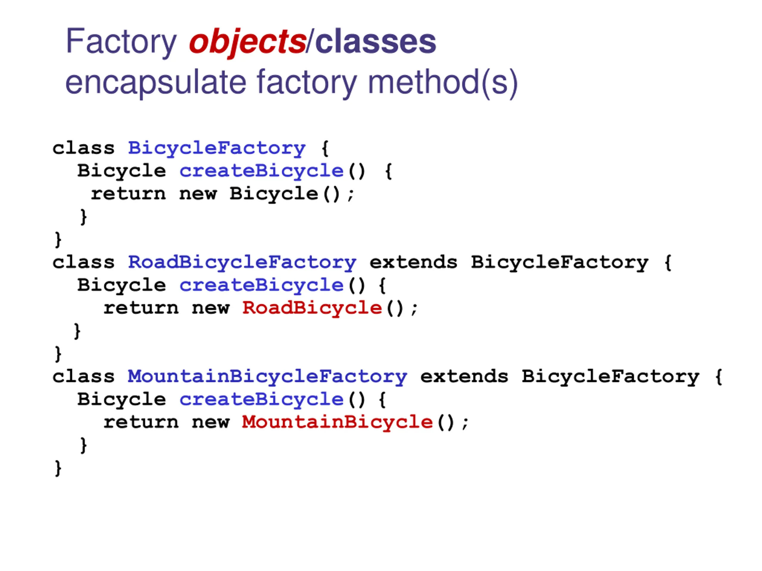 Factory objects/classes encapsulate factory method(s) class BicycleFactory { Bicycle createBicycle() { return new Bicycle(); } } class RoadBicycleFactory extends BicycleFactory { Bicycle createBicycle(){ return new RoadBicycle(); } } class MountainBicycleFactory extends BicycleFactory { Bicycle createBicycle(){ return new MountainBicycle(); } }