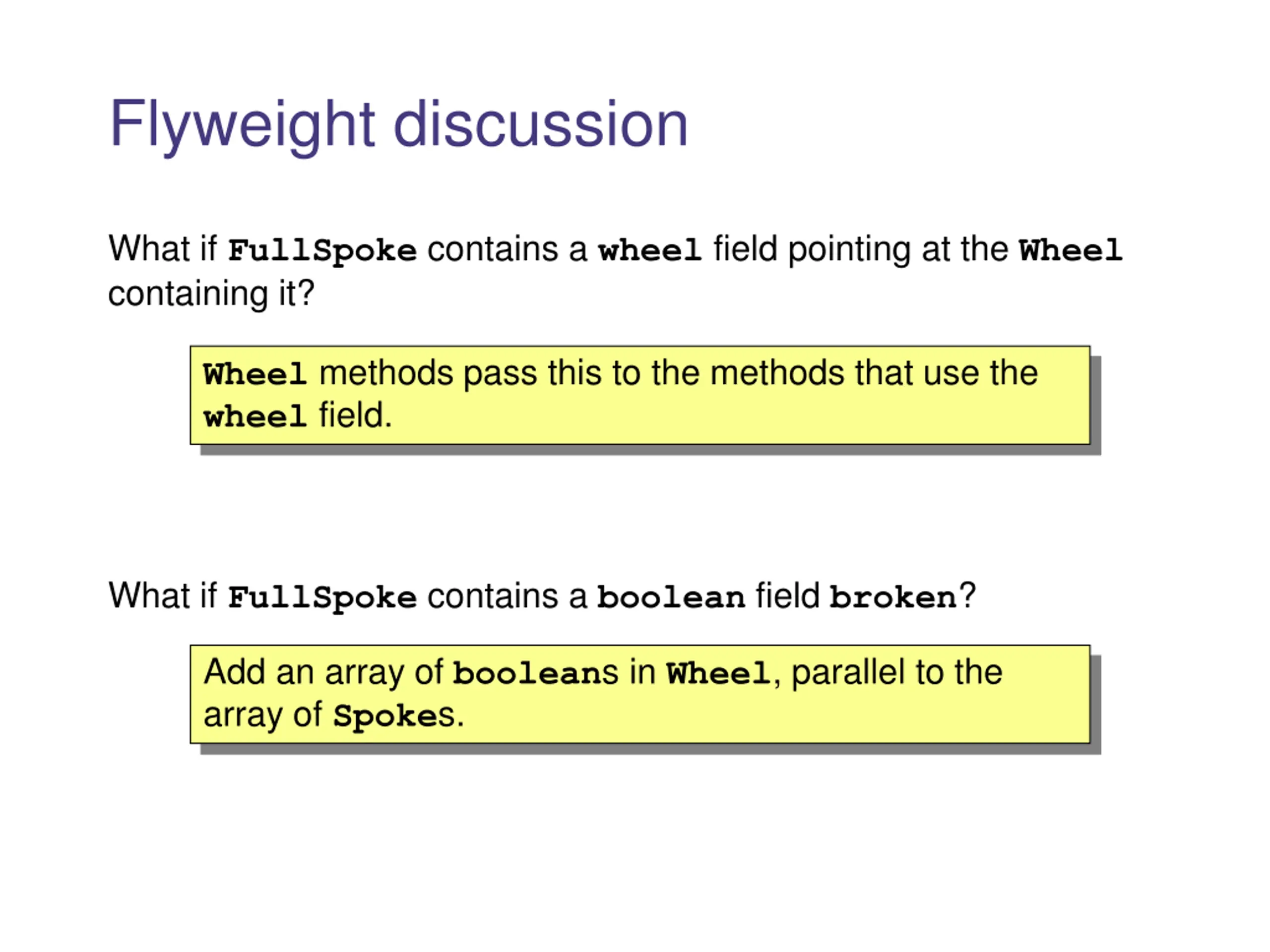 Flyweight discussion What if FullSpoke contains a wheel field pointing at the Wheel containing it? Wheel methods pass this to the methods that use the wheel field. What if FullSpoke contains a boolean field broken? Add an array of booleans in Wheel, parallel to the array of Spokes.