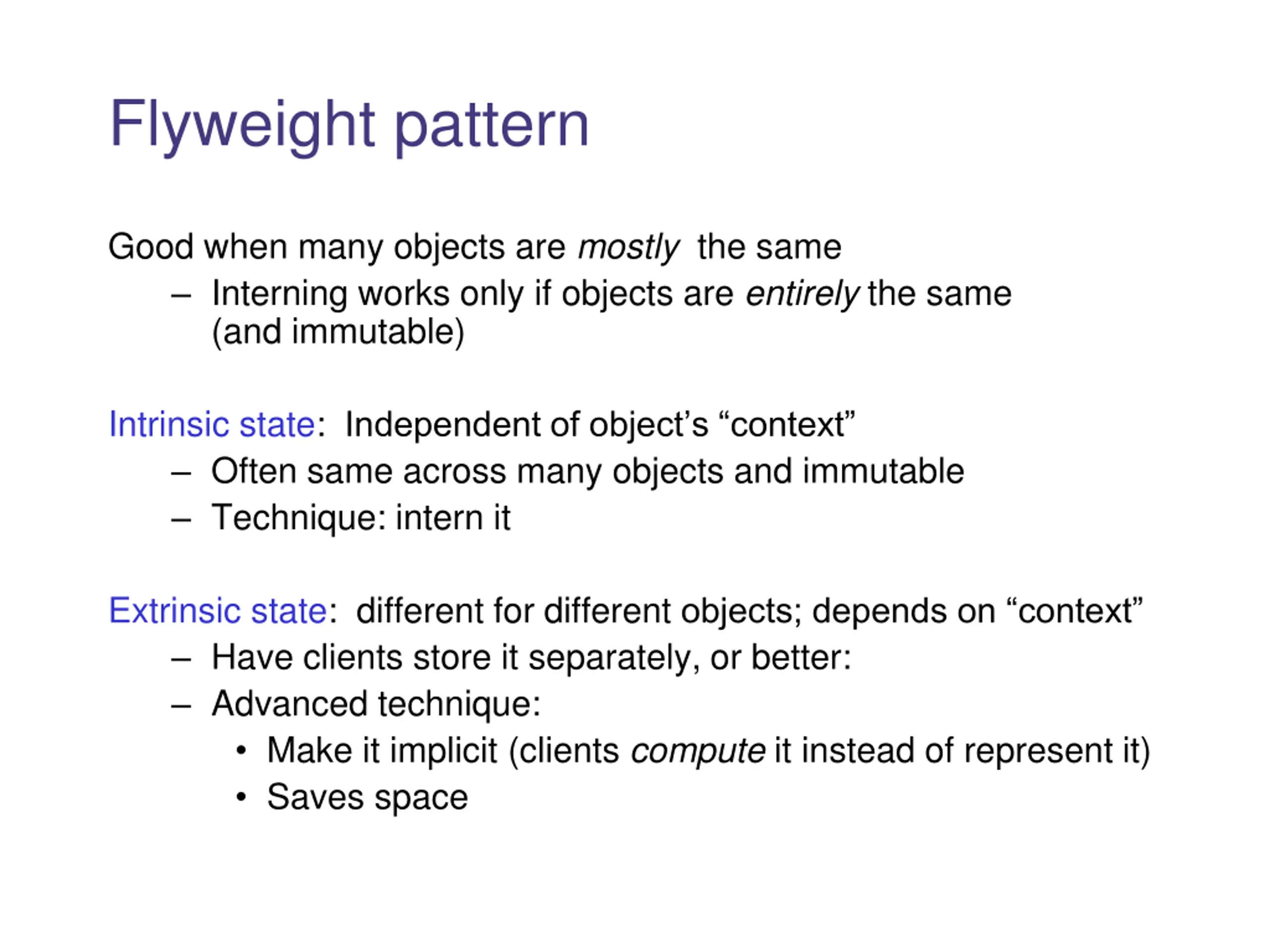 Flyweight pattern Good when many objects are mostly the same Interning works only if objects are entirely the same (and immutable) Intrinsic state: Independent of object s context Often same across many objects and immutable Technique: intern it Extrinsic state: different for different objects; depends on context Have clients store it separately, or better: Advanced technique: Make it implicit (clients compute it instead of represent it) Saves space