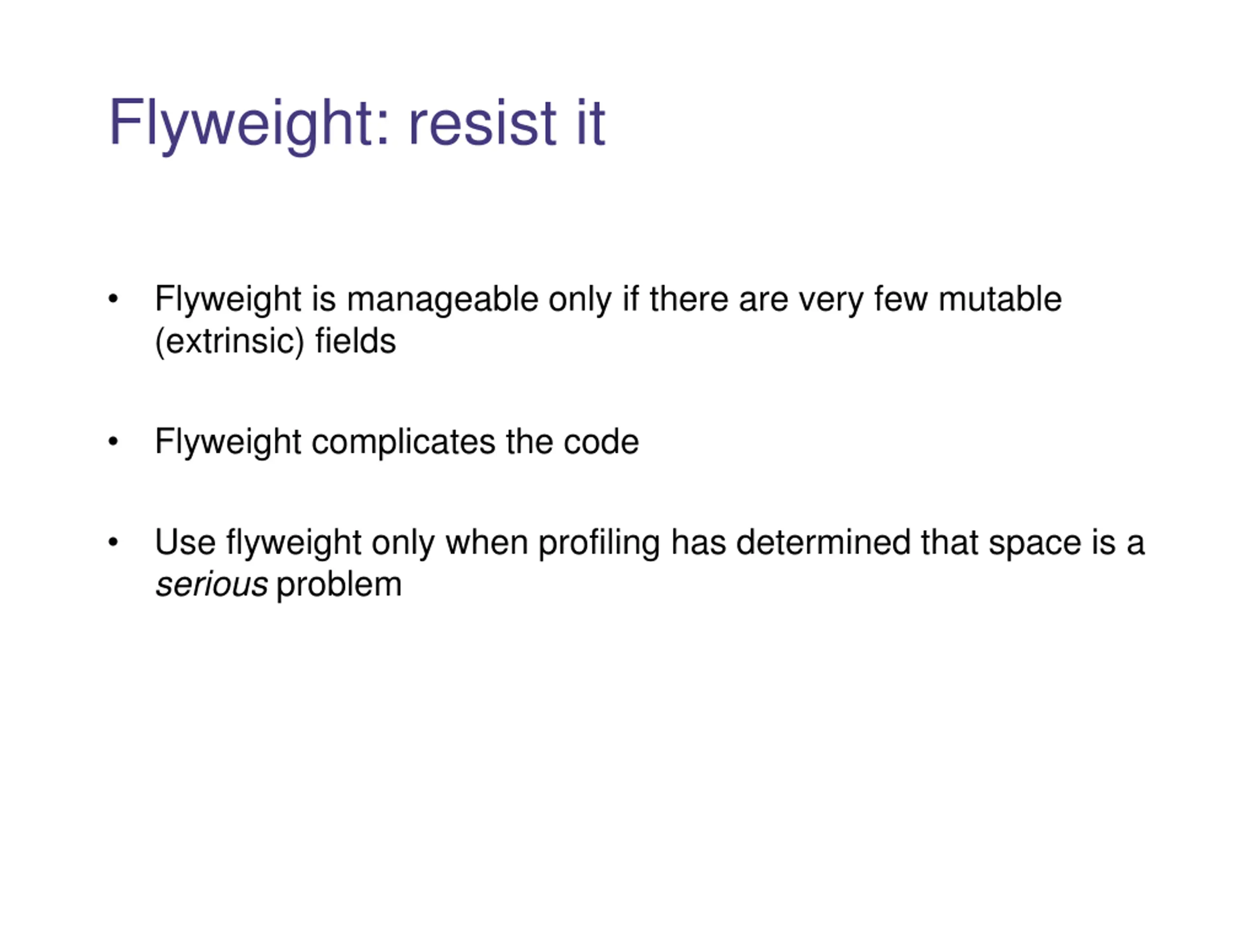 Flyweight: resist it Flyweight is manageable only if there are very few mutable (extrinsic) fields Flyweight complicates the code Use flyweight only when profiling has determined that space is a serious problem