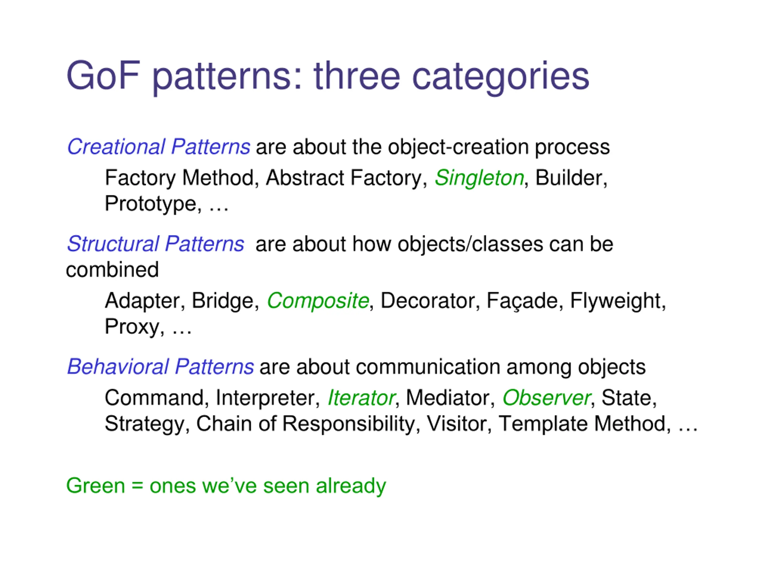 GoF patterns: three categories Creational Patterns are about the object-creation process Factory Method, Abstract Factory, Singleton, Builder, Prototype, Structural Patterns are about how objects/classes can be combined Adapter, Bridge, Composite, Decorator, Fa ade, Flyweight, Proxy, Behavioral Patterns are about communication among objects Command, Interpreter, Iterator, Mediator, Observer, State, Strategy, Chain of Responsibility, Visitor, Template Method, Green = ones we ve seen already