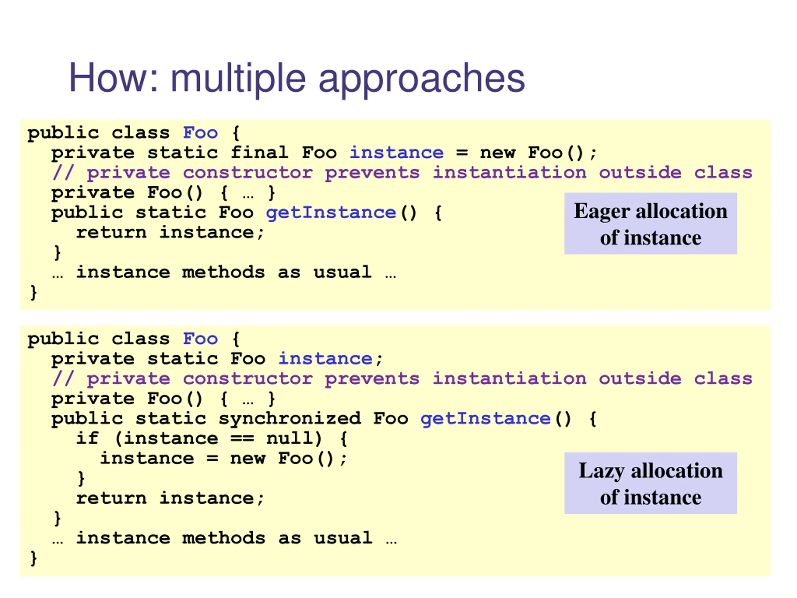 How: multiple approaches public class Foo { private static final Foo instance = new Foo(); // private constructor prevents instantiation outside class private Foo() { } public static Foo getInstance() { return instance; } instance methods as usual } Eager allocation of instance public class Foo { private static Foo instance; // private constructor prevents instantiation outside class private Foo() { } public static synchronized Foo getInstance() { if (instance == null) { instance = new Foo(); } return instance; } instance methods as usual } Lazy allocation of instance