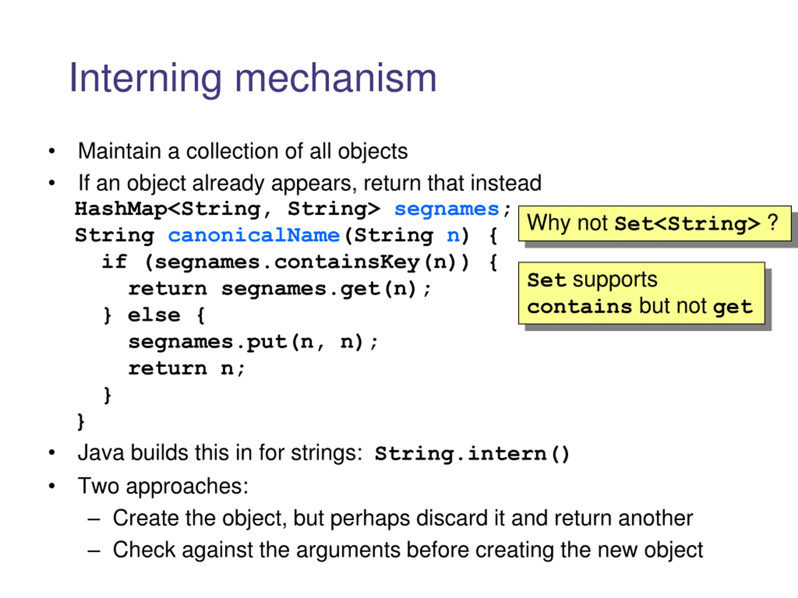 Interning mechanism Maintain a collection of all objects If an object already appears, return that instead HashMap<String, String> segnames; String canonicalName(String n) { if (segnames.containsKey(n)) { return segnames.get(n); } else { segnames.put(n, n); return n; } } Java builds this in for strings: String.intern() Two approaches: Create the object, but perhaps discard it and return another Check against the arguments before creating the new object Why not Set<String> ? Set supports contains but not get