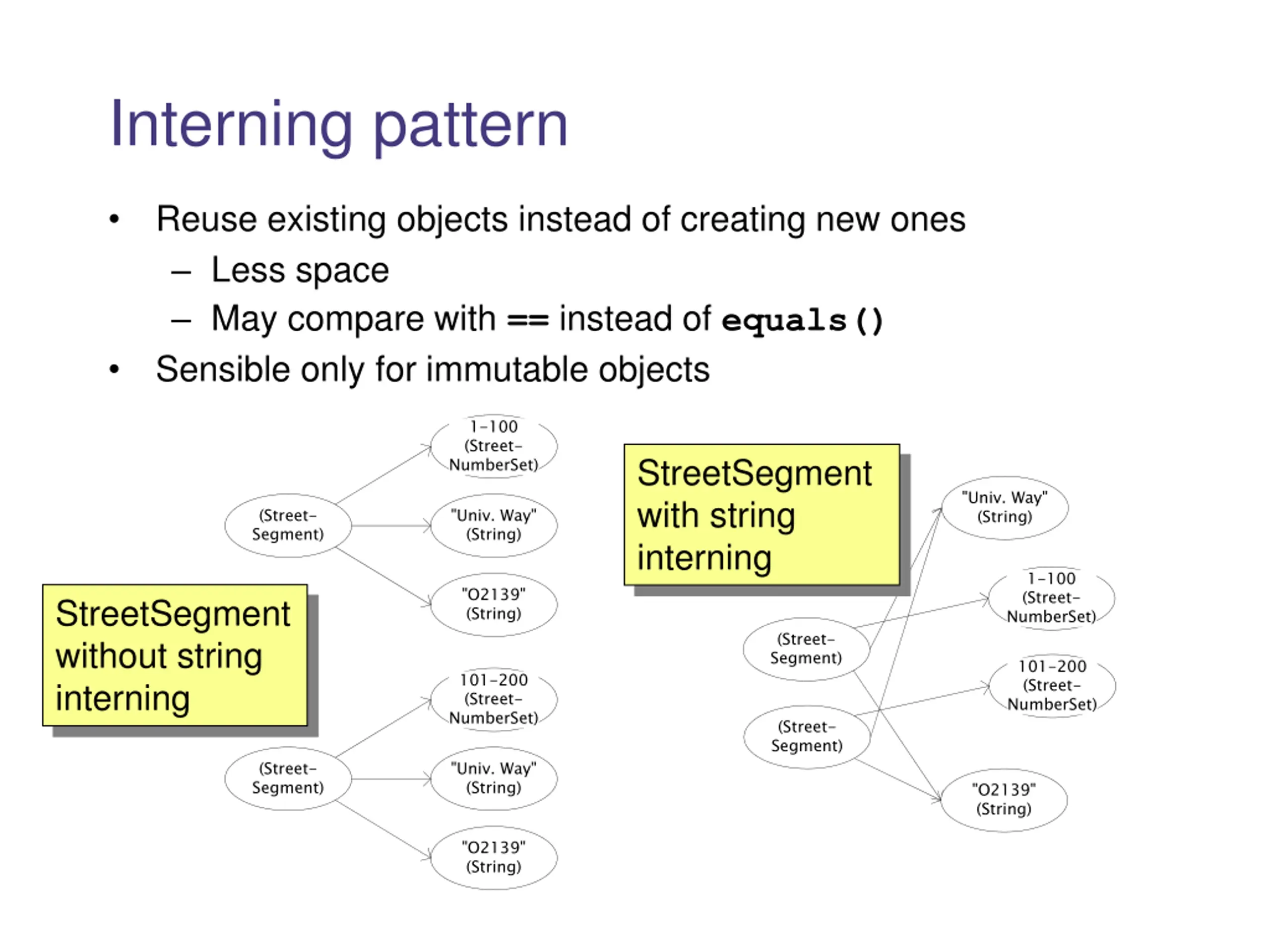 Interning pattern Reuse existing objects instead of creating new ones Less space May compare with == instead of equals() Sensible only for immutable objects 1-100 (Street- NumberSet) StreetSegment with string interning "Univ. Way" (String) (Street- Segment) "Univ. Way" (String) 1-100 (Street- NumberSet) "O2139" (String) StreetSegment without string interning (Street- Segment) 101-200 (Street- NumberSet) 101-200 (Street- NumberSet) (Street- Segment) (Street- Segment) "Univ. Way" (String) "O2139" (String) "O2139" (String)