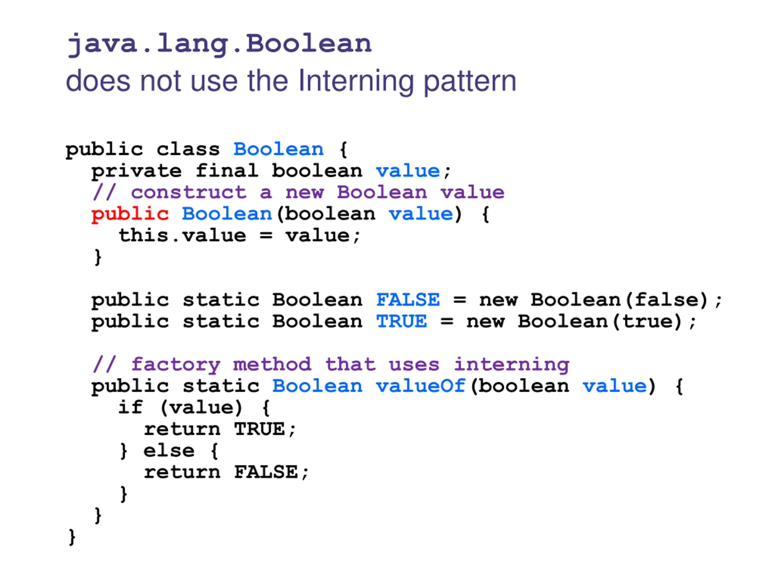 java.lang.Boolean does not use the Interning pattern public class Boolean { private final boolean value; // construct a new Boolean value public Boolean(boolean value) { this.value = value; } public static Boolean FALSE = new Boolean(false); public static Boolean TRUE = new Boolean(true); // factory method that uses interning public static Boolean valueOf(boolean value) { if (value) { return TRUE; } else { return FALSE; } } }