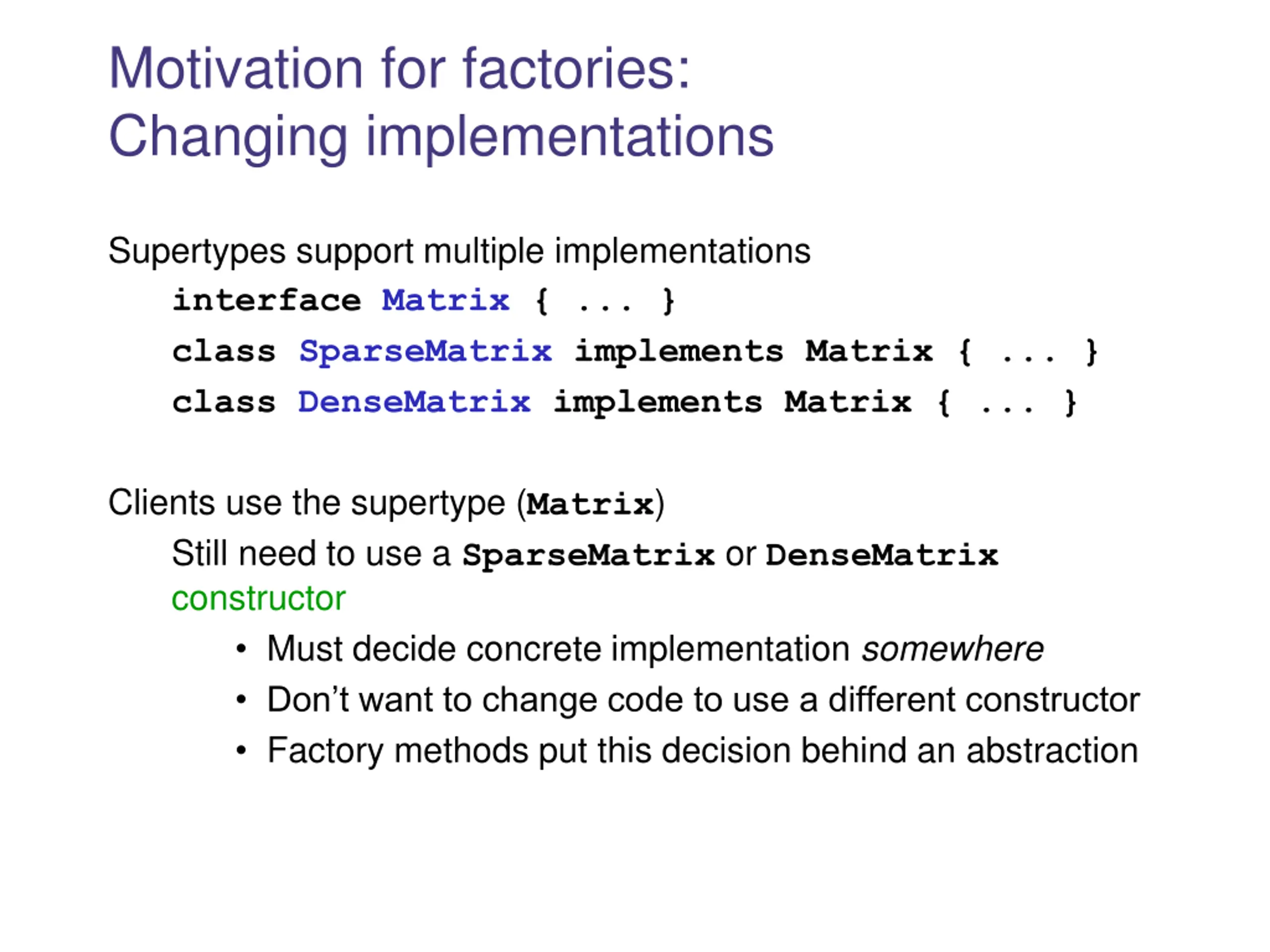 Motivation for factories: Changing implementations Supertypes support multiple implementations interface Matrix { ... } class SparseMatrix implements Matrix { ... } class DenseMatrix implements Matrix { ... } Clients use the supertype (Matrix) Still need to use a SparseMatrix or DenseMatrix constructor Must decide concrete implementation somewhere Don t want to change code to use a different constructor Factory methods put this decision behind an abstraction