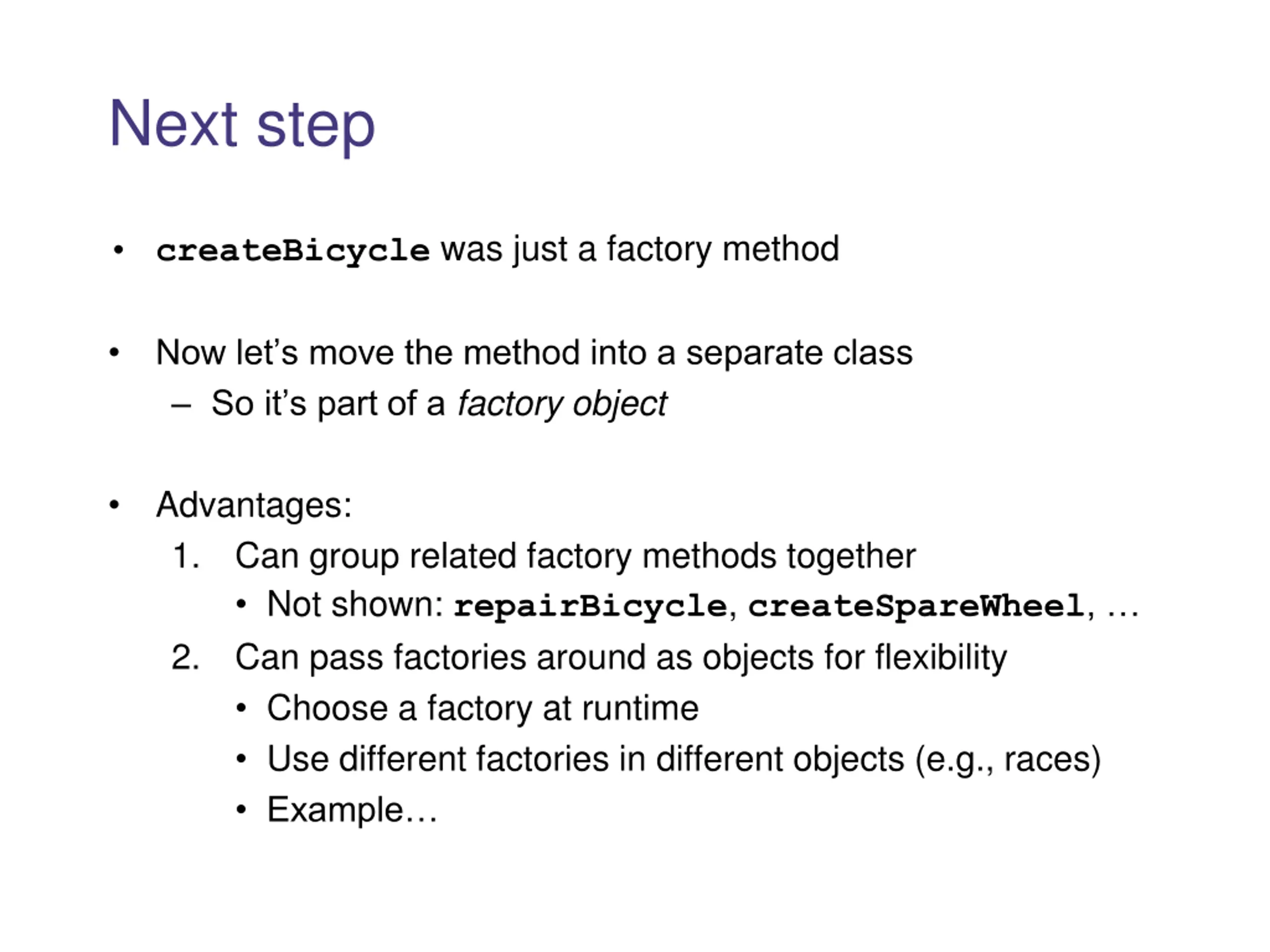 Next step createBicycle was just a factory method Now let s move the method into a separate class So it s part of a factory object Advantages: 1. Can group related factory methods together Not shown: repairBicycle, createSpareWheel, 2. Can pass factories around as objects for flexibility Choose a factory at runtime Use different factories in different objects (e.g., races) Example