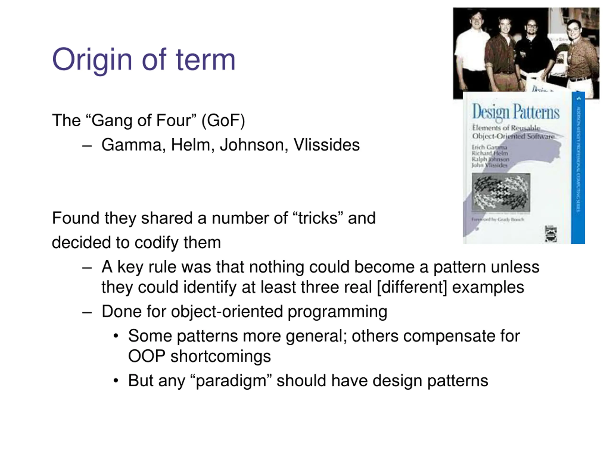 Origin of term The Gang of Four (GoF) Gamma, Helm, Johnson, Vlissides Found they shared a number of tricks and decided to codify them A key rule was that nothing could become a pattern unless they could identify at least three real [different] examples Done for object-oriented programming Some patterns more general; others compensate for OOP shortcomings But any paradigm should have design patterns