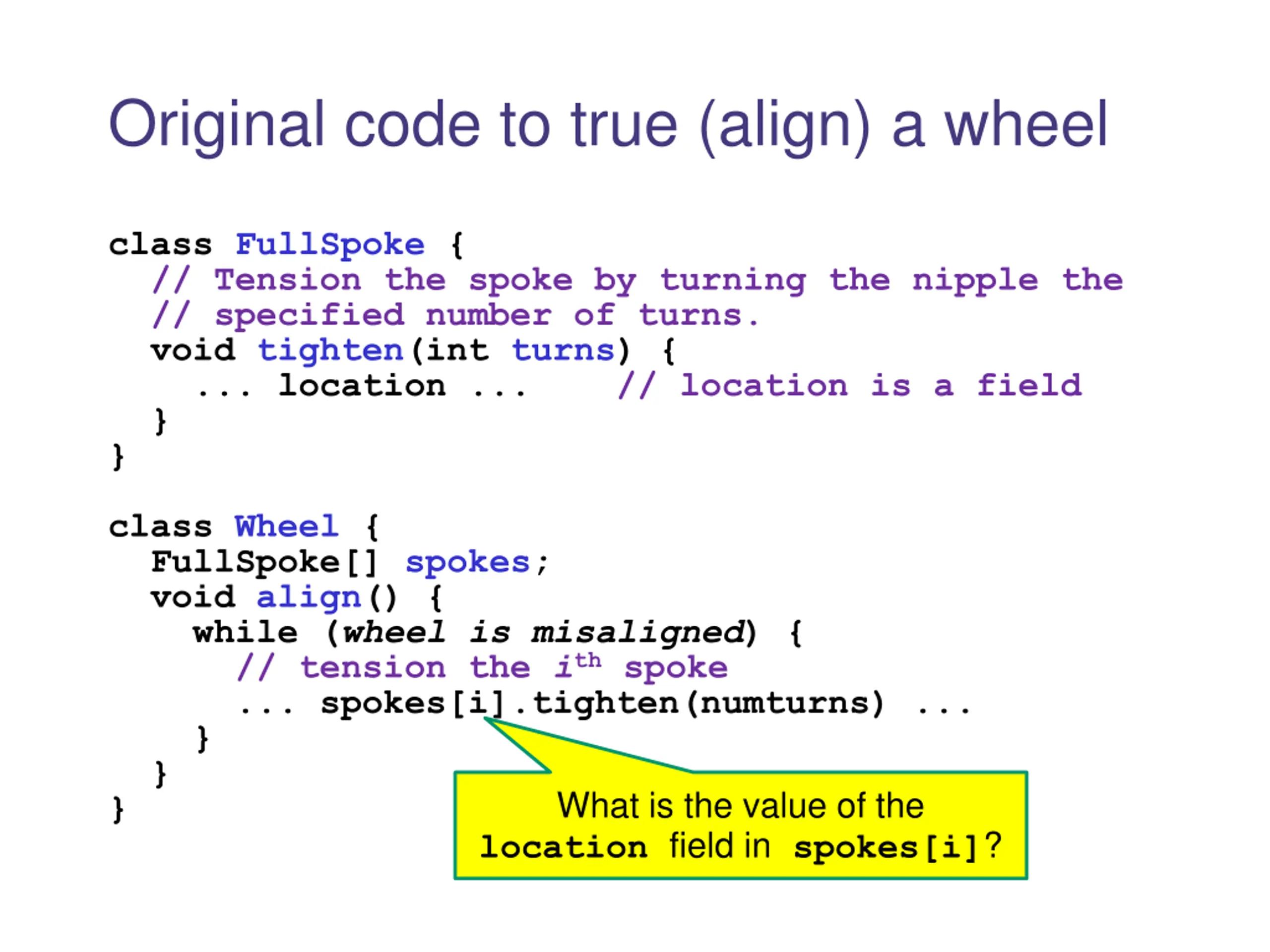 Original code to true (align) a wheel class FullSpoke { // Tension the spoke by turning the nipple the // specified number of turns. void tighten(int turns) { ... location ... // location is a field } } class Wheel { FullSpoke[] spokes; void align() { while (wheel is misaligned) { // tension the ith spoke ... spokes[i].tighten(numturns) ... } } } location field in spokes[i]? What is the value of the