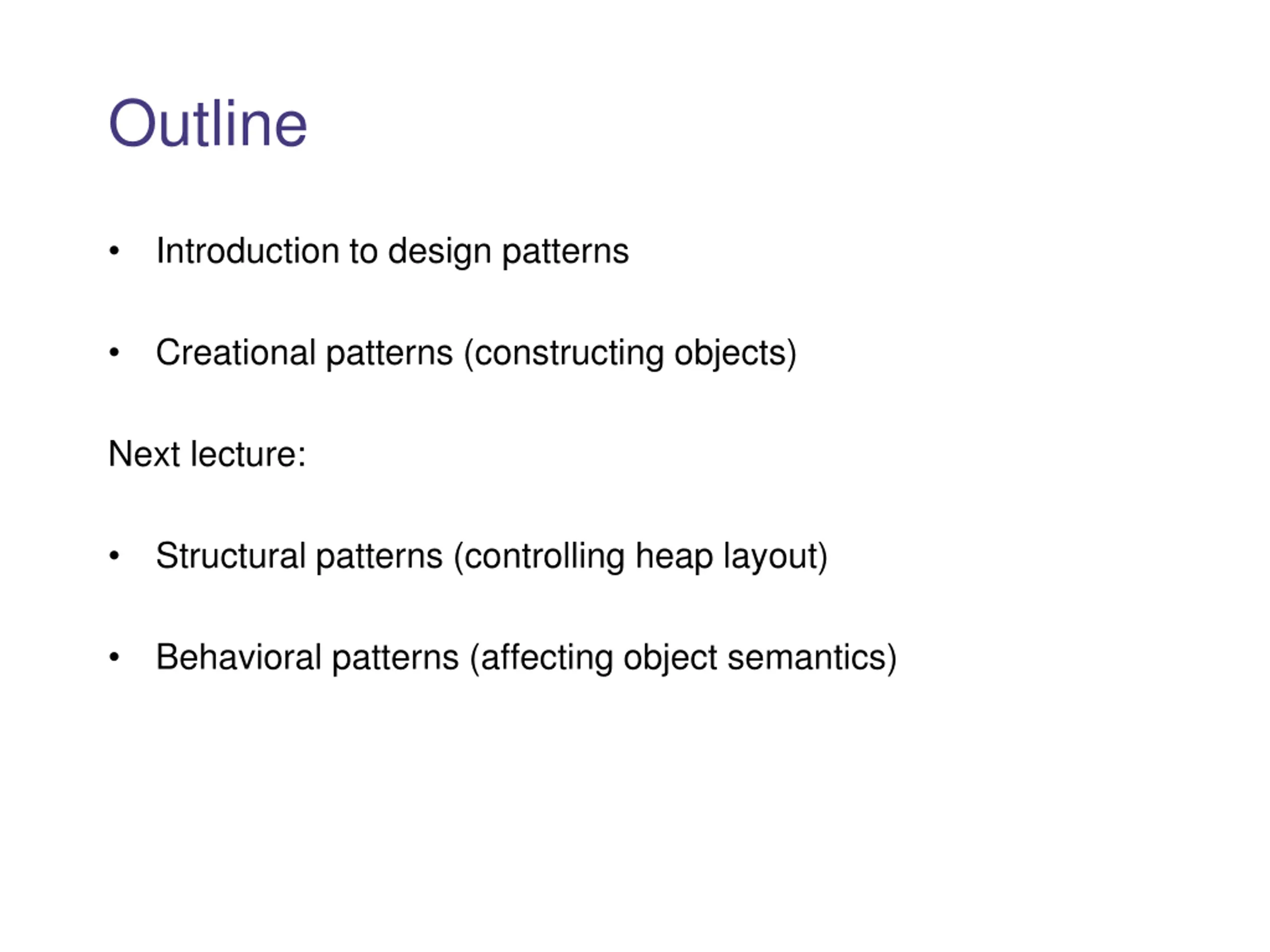 Outline Introduction to design patterns Creational patterns (constructing objects) Next lecture: Structural patterns (controlling heap layout) Behavioral patterns (affecting object semantics)