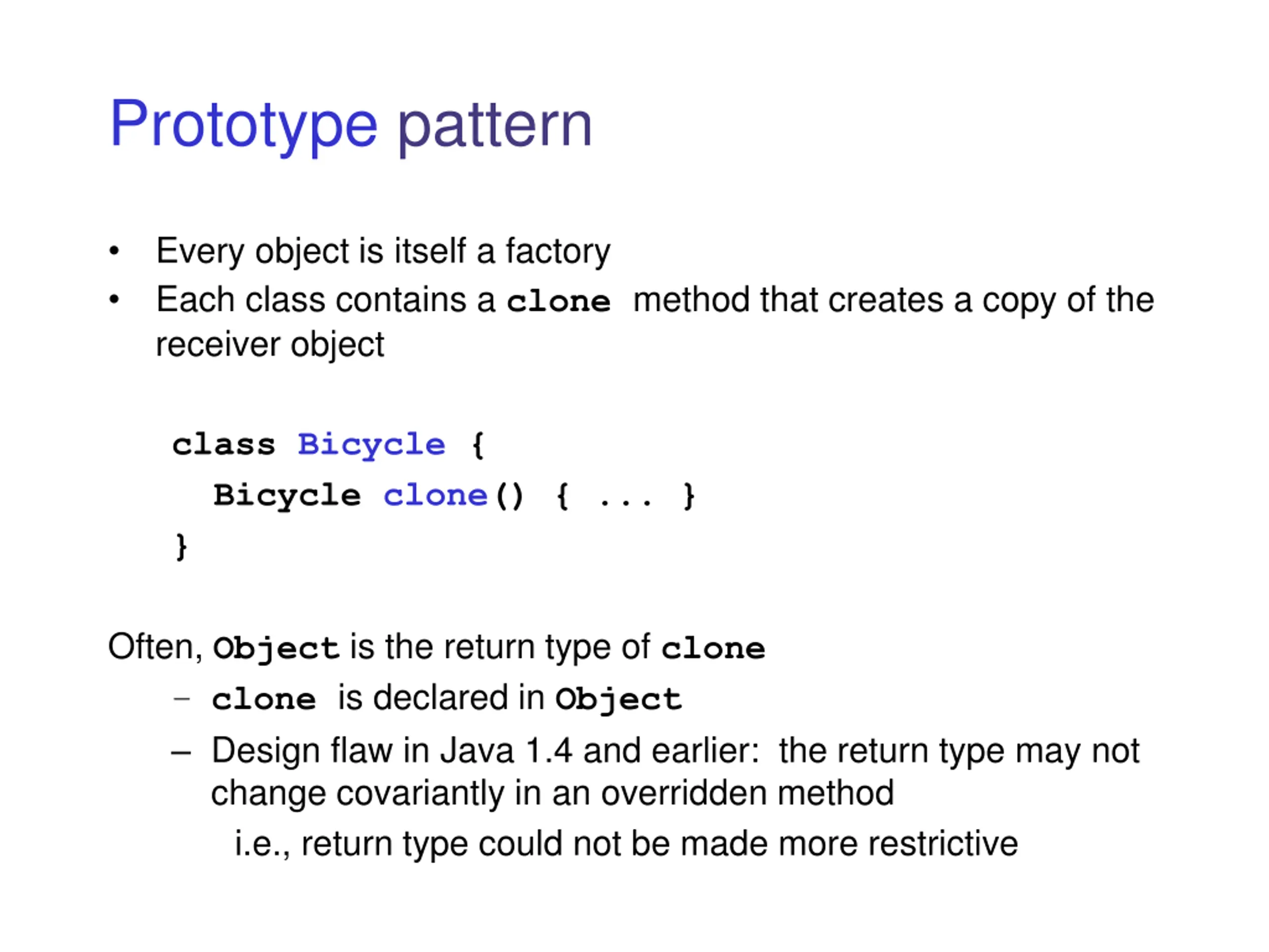 Prototype pattern Every object is itself a factory Each class contains a clone method that creates a copy of the receiver object class Bicycle { Bicycle clone() { ... } } Often, Object is the return type of clone clone is declared in Object Design flaw in Java 1.4 and earlier: the return type may not change covariantly in an overridden method i.e., return type could not be made more restrictive