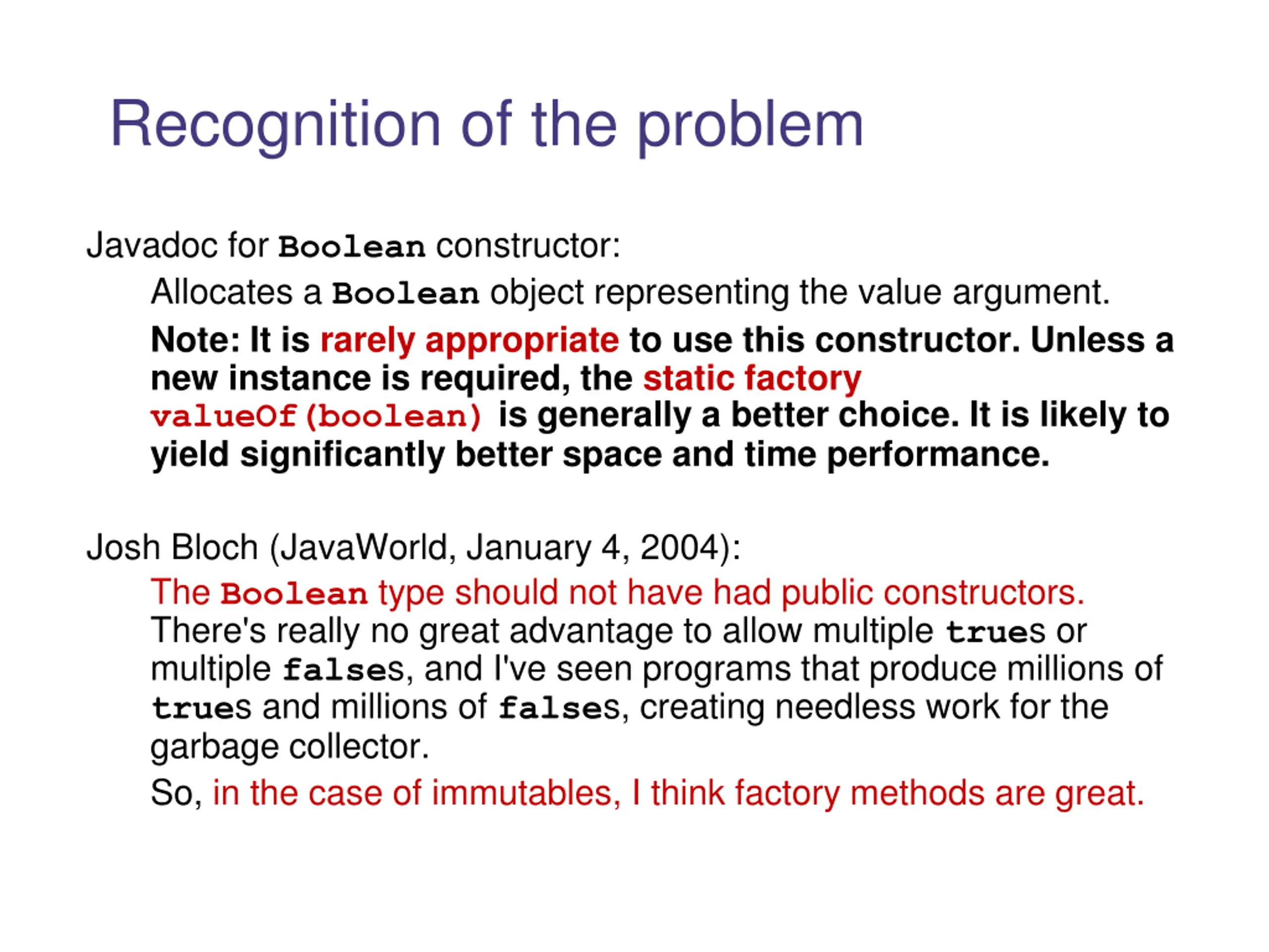 Recognition of the problem Javadoc for Boolean constructor: Allocates a Boolean object representing the value argument. Note: It is rarely appropriate to use this constructor. Unless a new instance is required, the static factory valueOf(boolean) is generally a better choice. It is likely to yield significantly better space and time performance. Josh Bloch (JavaWorld, January 4, 2004): The Boolean type should not have had public constructors. There's really no great advantage to allow multiple trues or multiple falses, and I've seen programs that produce millions of trues and millions of falses, creating needless work for the garbage collector. So, in the case of immutables, I think factory methods are great.