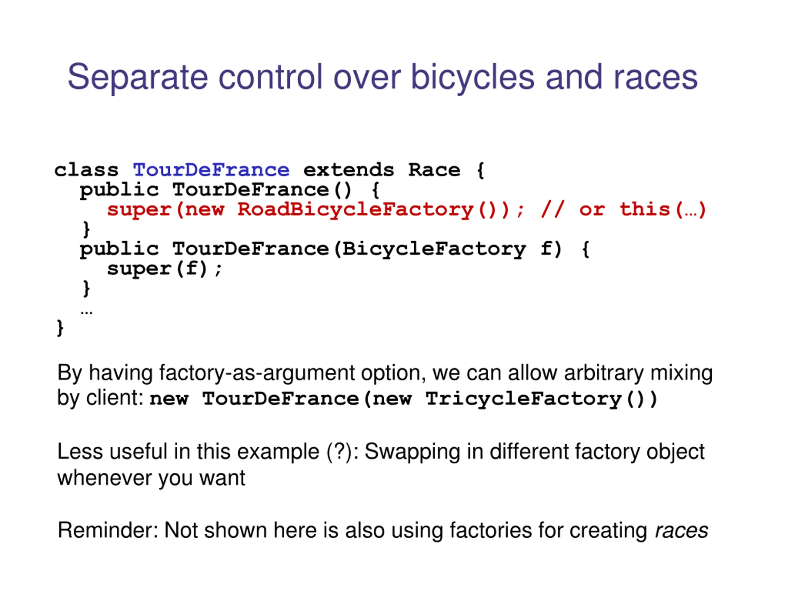 Separate control over bicycles and races class TourDeFrance extends Race { public TourDeFrance() { super(new RoadBicycleFactory()); // or this( ) } public TourDeFrance(BicycleFactory f) { super(f); } } By having factory-as-argument option, we can allow arbitrary mixing by client: new TourDeFrance(new TricycleFactory()) Less useful in this example (?): Swapping in different factory object whenever you want Reminder: Not shown here is also using factories for creating races
