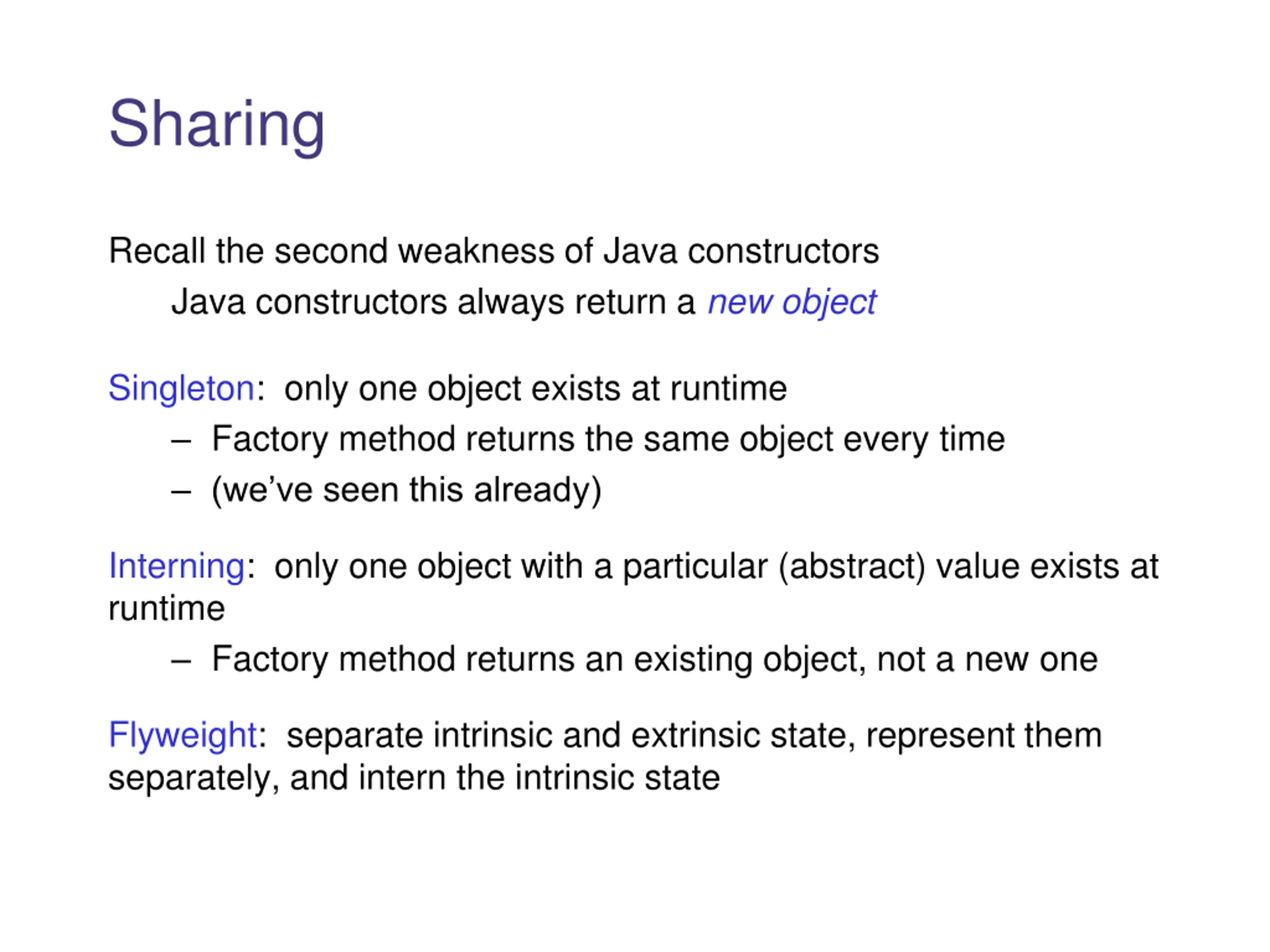 Sharing Recall the second weakness of Java constructors Java constructors always return a new object Singleton: only one object exists at runtime Factory method returns the same object every time (we ve seen this already) Interning: only one object with a particular (abstract) value exists at runtime Factory method returns an existing object, not a new one Flyweight: separate intrinsic and extrinsic state, represent them separately, and intern the intrinsic state