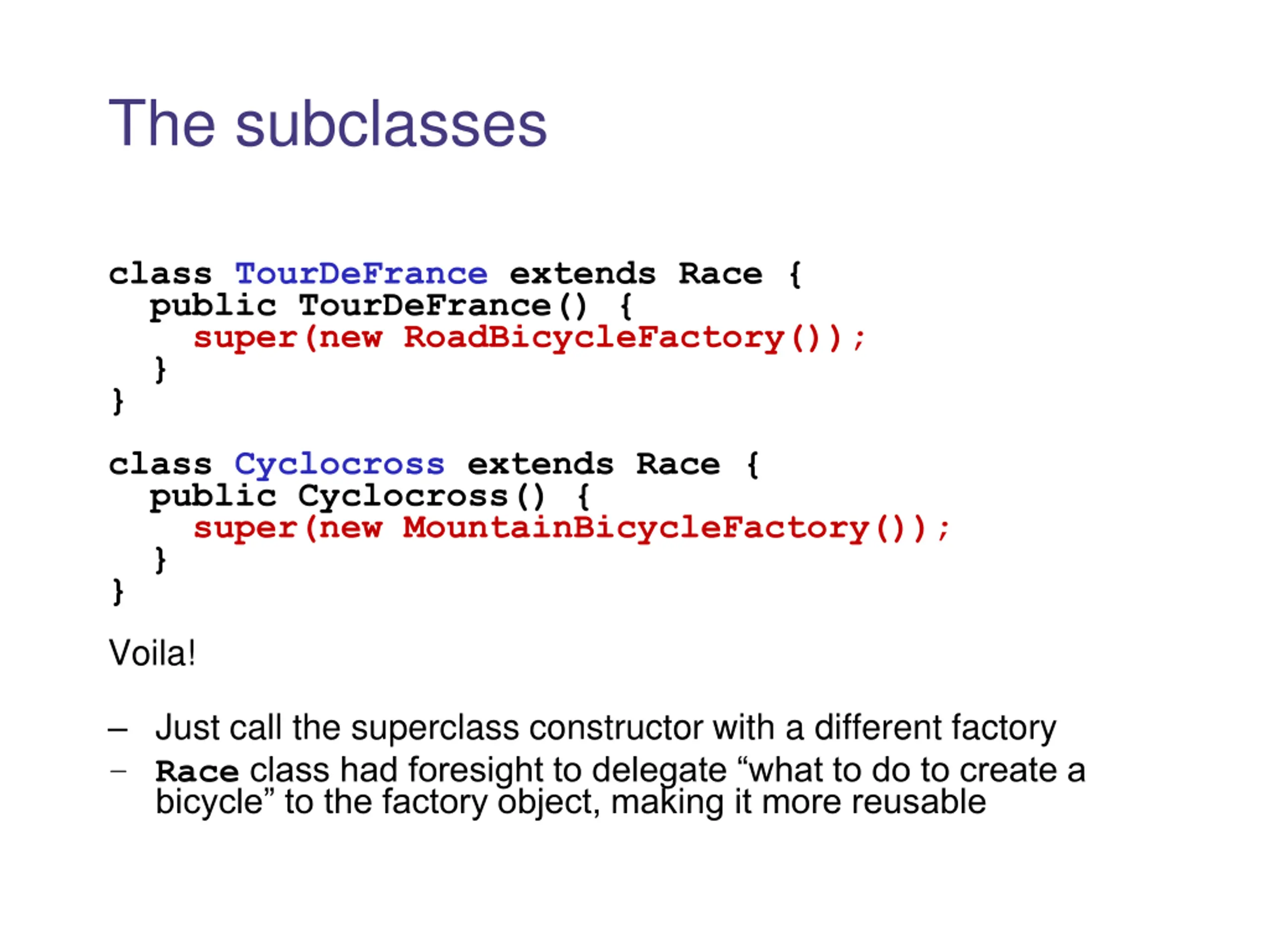 The subclasses class TourDeFrance extends Race { public TourDeFrance() { super(new RoadBicycleFactory()); } } class Cyclocross extends Race { public Cyclocross() { super(new MountainBicycleFactory()); } } Voila! Just call the superclass constructor with a different factory Raceclass had foresight to delegate what to do to create a bicycle to the factory object, making it more reusable