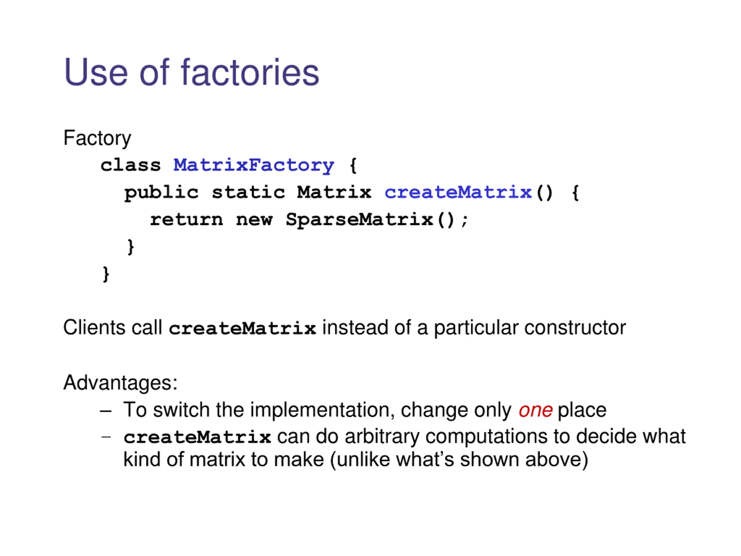 Use of factories Factory class MatrixFactory { public static Matrix createMatrix() { return new SparseMatrix(); } } Clients call createMatrix instead of a particular constructor Advantages: To switch the implementation, change only one place createMatrix can do arbitrary computations to decide what kind of matrix to make (unlike what s shown above)