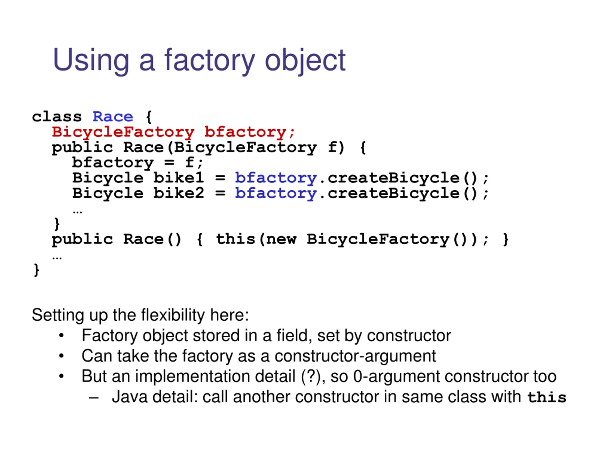 Using a factory object class Race { BicycleFactory bfactory; public Race(BicycleFactory f) { bfactory = f; Bicycle bike1 = bfactory.createBicycle(); Bicycle bike2 = bfactory.createBicycle(); } public Race() { this(new BicycleFactory()); } } Setting up the flexibility here: Factory object stored in a field, set by constructor Can take the factory as a constructor-argument But an implementation detail (?), so 0-argument constructor too Java detail: call another constructor in same class with this