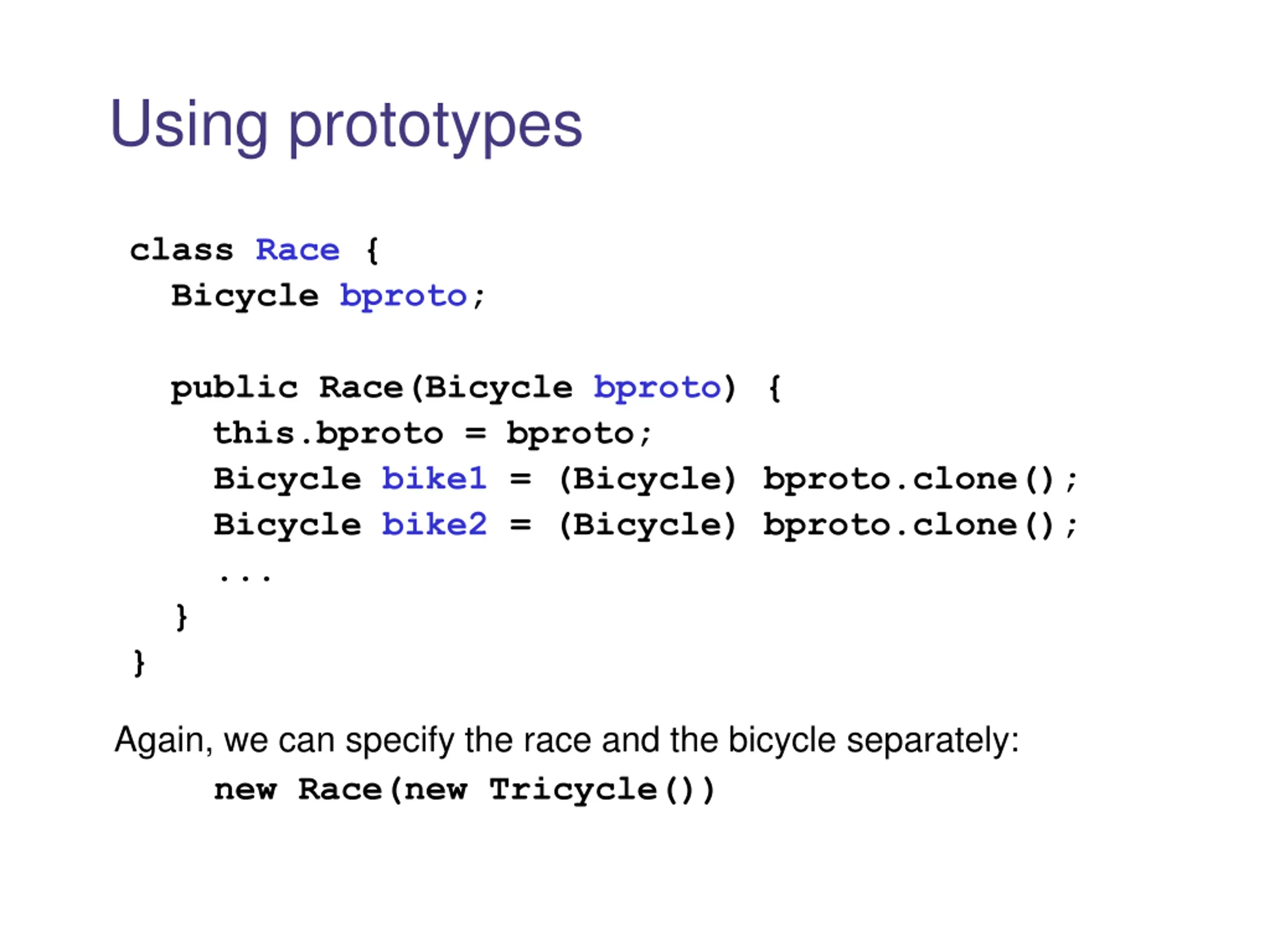 Using prototypes class Race { Bicycle bproto; public Race(Bicycle bproto) { this.bproto = bproto; Bicycle bike1 = (Bicycle) bproto.clone(); Bicycle bike2 = (Bicycle) bproto.clone(); ... } } Again, we can specify the race and the bicycle separately: new Race(new Tricycle())