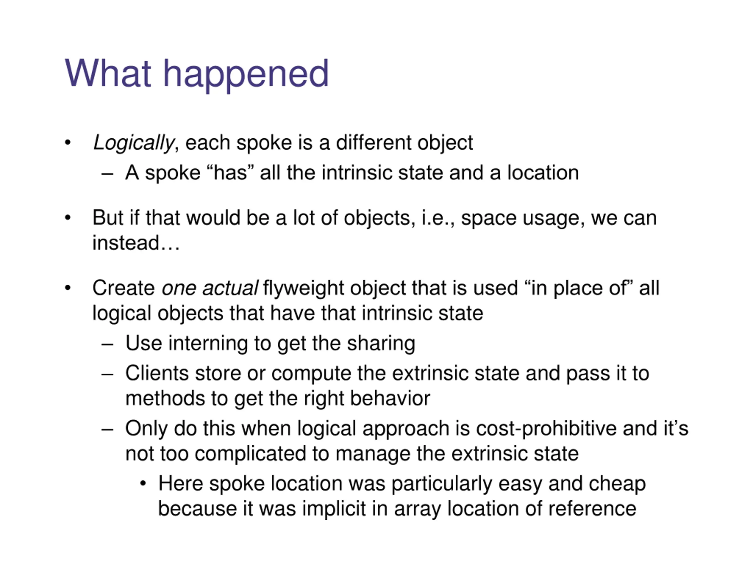 What happened Logically, each spoke is a different object A spoke has all the intrinsic state and a location But if that would be a lot of objects, i.e., space usage, we can instead Create oneactualflyweight object that is used in place of all logical objects that have that intrinsic state Use interning to get the sharing Clients store or compute the extrinsic state and pass it to methods to get the right behavior Only do this when logical approach is cost-prohibitive and it s not too complicated to manage the extrinsic state Here spoke location was particularly easy and cheap because it was implicit in array location of reference