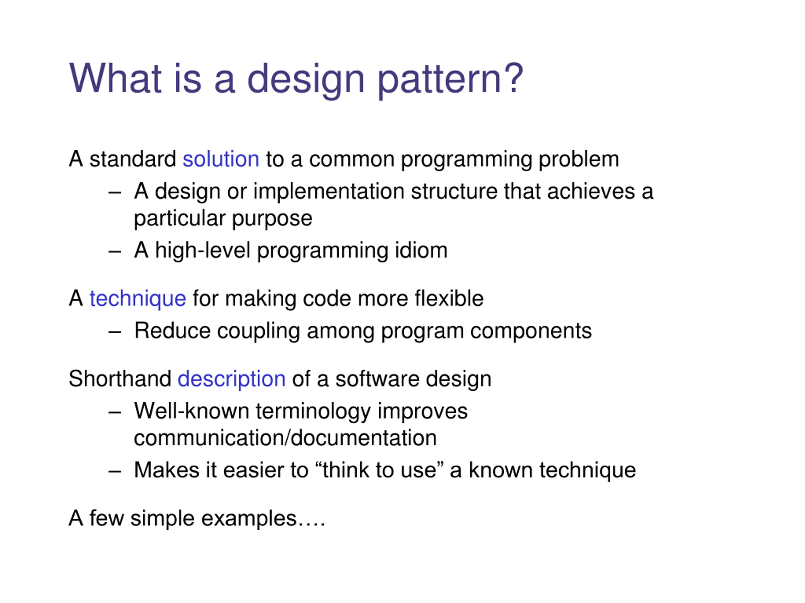 What is a design pattern? A standard solution to a common programming problem A design or implementation structure that achieves a particular purpose A high-level programming idiom A technique for making code more flexible Reduce coupling among program components Shorthand description of a software design Well-known terminology improves communication/documentation Makes it easier to think to use a known technique A few simple examples .