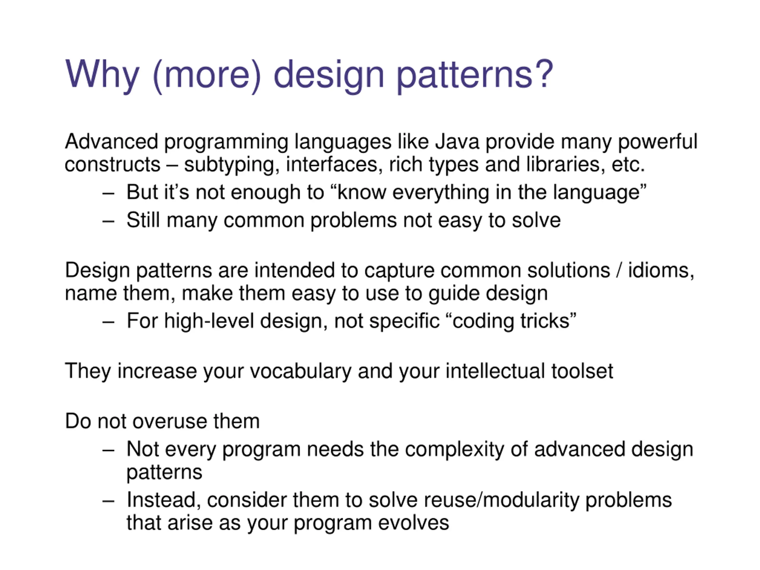 Why (more) design patterns? Advanced programming languages like Java provide many powerful constructs subtyping, interfaces, rich types and libraries, etc. But it s not enough to know everything in the language Still many common problems not easy to solve Design patterns are intended to capture common solutions / idioms, name them, make them easy to use to guide design For high-level design, not specific coding tricks They increase your vocabulary and your intellectual toolset Do not overuse them Not every program needs the complexity of advanced design patterns Instead, consider them to solve reuse/modularity problems that arise as your program evolves