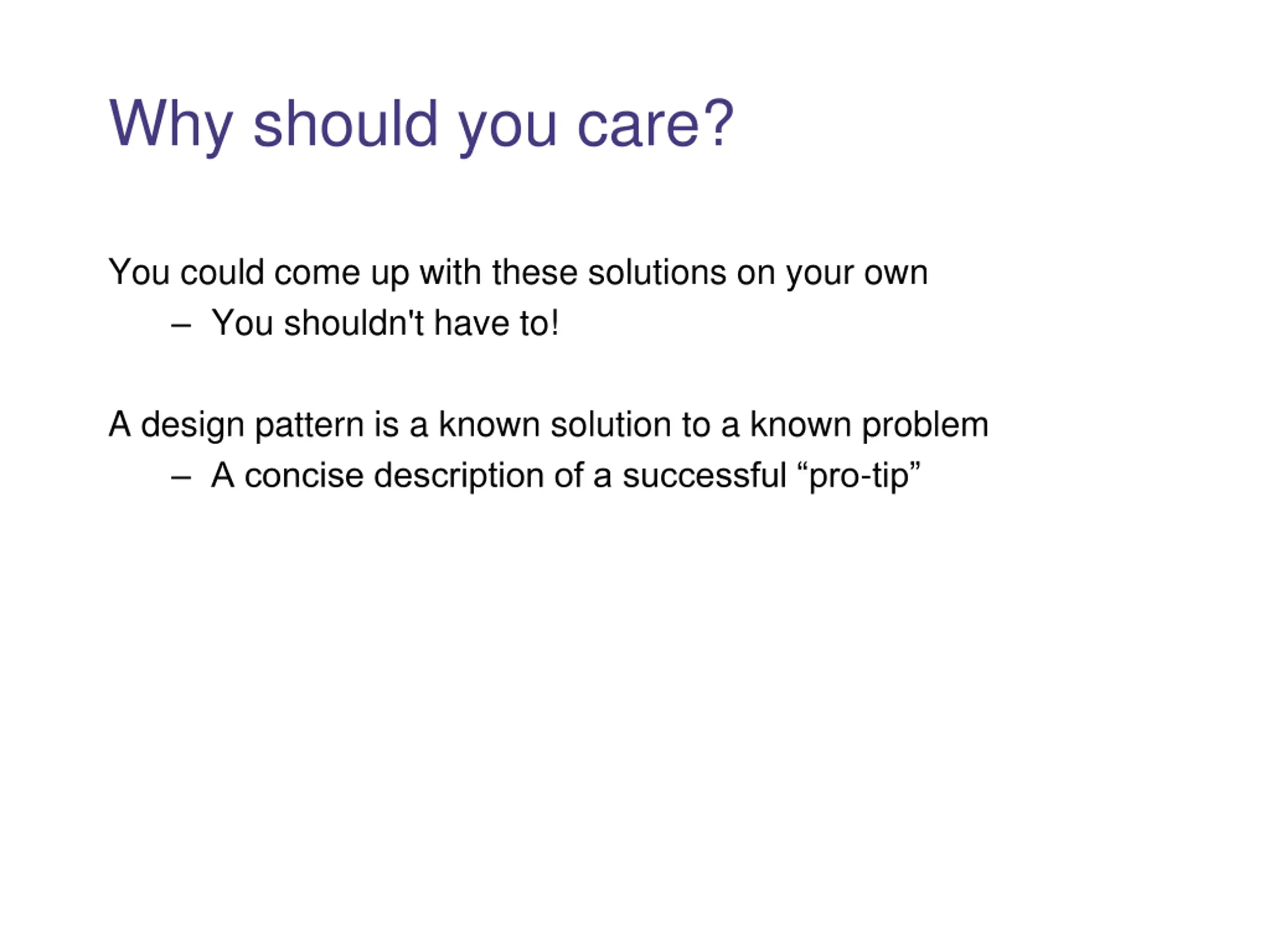 Why should you care? You could come up with these solutions on your own You shouldn't have to! A design pattern is a known solution to a known problem A concise description of a successful pro-tip