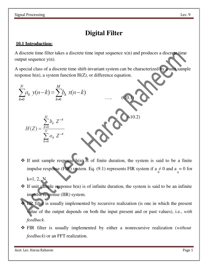 Signal Processing Lec. 9 Digital Filter 10.1 Introduction: Adiscrete time filter takes a discrete time input sequence x(n) and produces a discrete time output sequence y(n). Aspecial class of a discrete time shift-invariant system can be characterized by a unit sample response h(n), a system function H(Z), or difference equation. ( 10.1) .. .. ( 10.2) If unit sample response h(n) is of finite duration, the system is said to be a finite impulse response (FIR) system. Eq. (9.1) represents FIR system if a 0 and a = 0 for 0 k k=1, 2,..N. If unit sample response h(n) is of infinite duration, the system is said to be an infinite impulse response (IIR) system. IIR filter is usually implemented by recursive realization (is one in which the present value of the output depends on both the input present and or past values), i.e., with feedback. FIR filter is usually implemented by either a nonrecursive realization (without feedback) or an FFT realization. Asst. Lec. Haraa Raheem Page 1