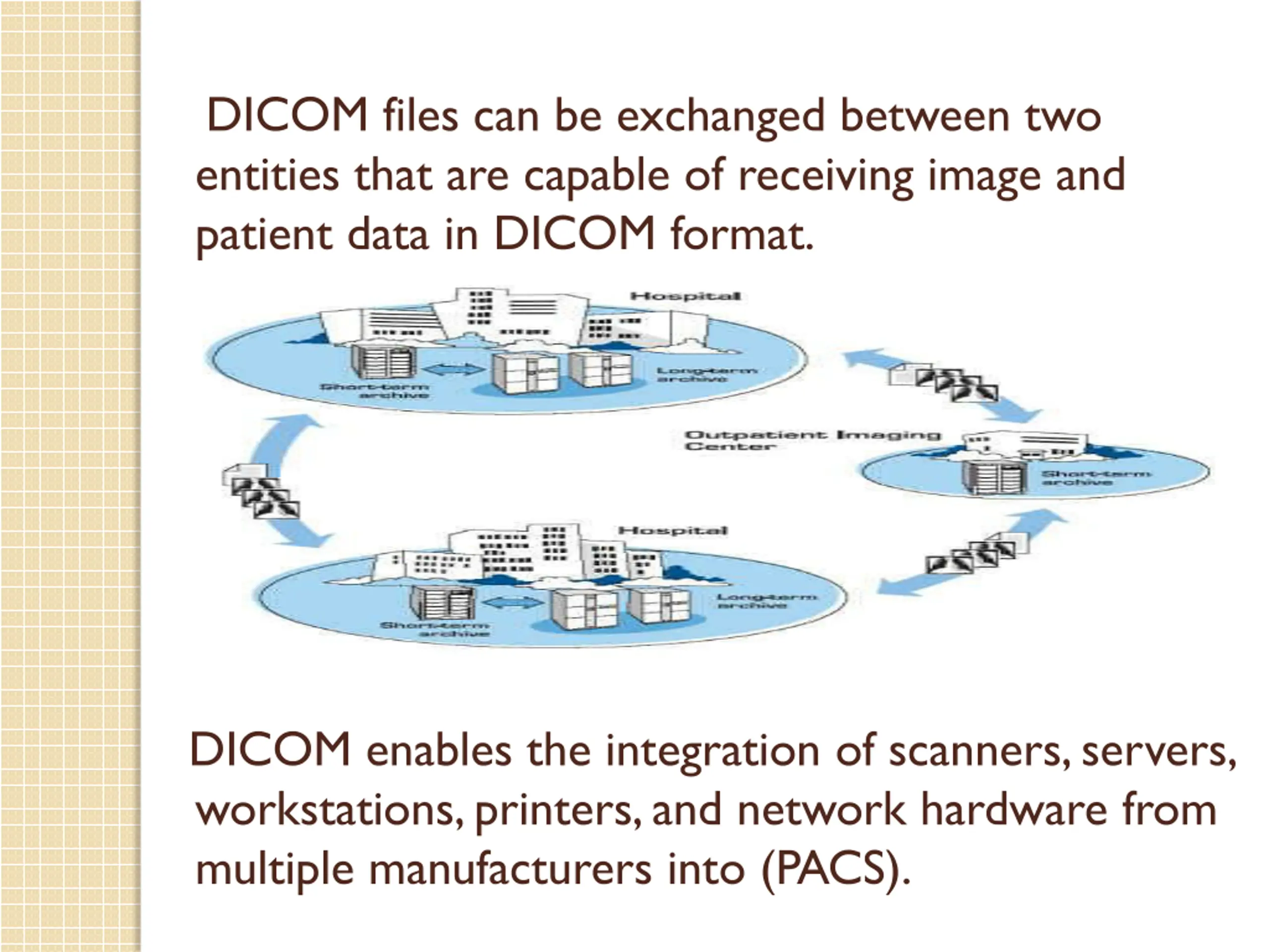 DICOM files can be exchanged between two entities that are capable of receiving image and patient data in DICOM format. DICOM enables the integration of scanners, servers, workstations, printers, and network hardware from multiple manufacturers into (PACS).