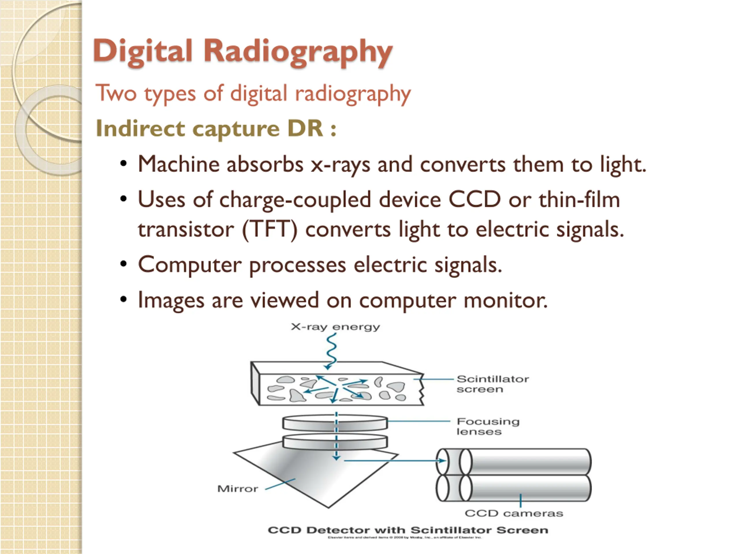 Digital Radiography Two types of digital radiography Indirect capture DR : Machine absorbs x-rays and converts them to light. Uses of charge-coupled device CCD or thin-film transistor (TFT) converts light to electric signals. Computer processes electric signals. Images are viewed on computer monitor.