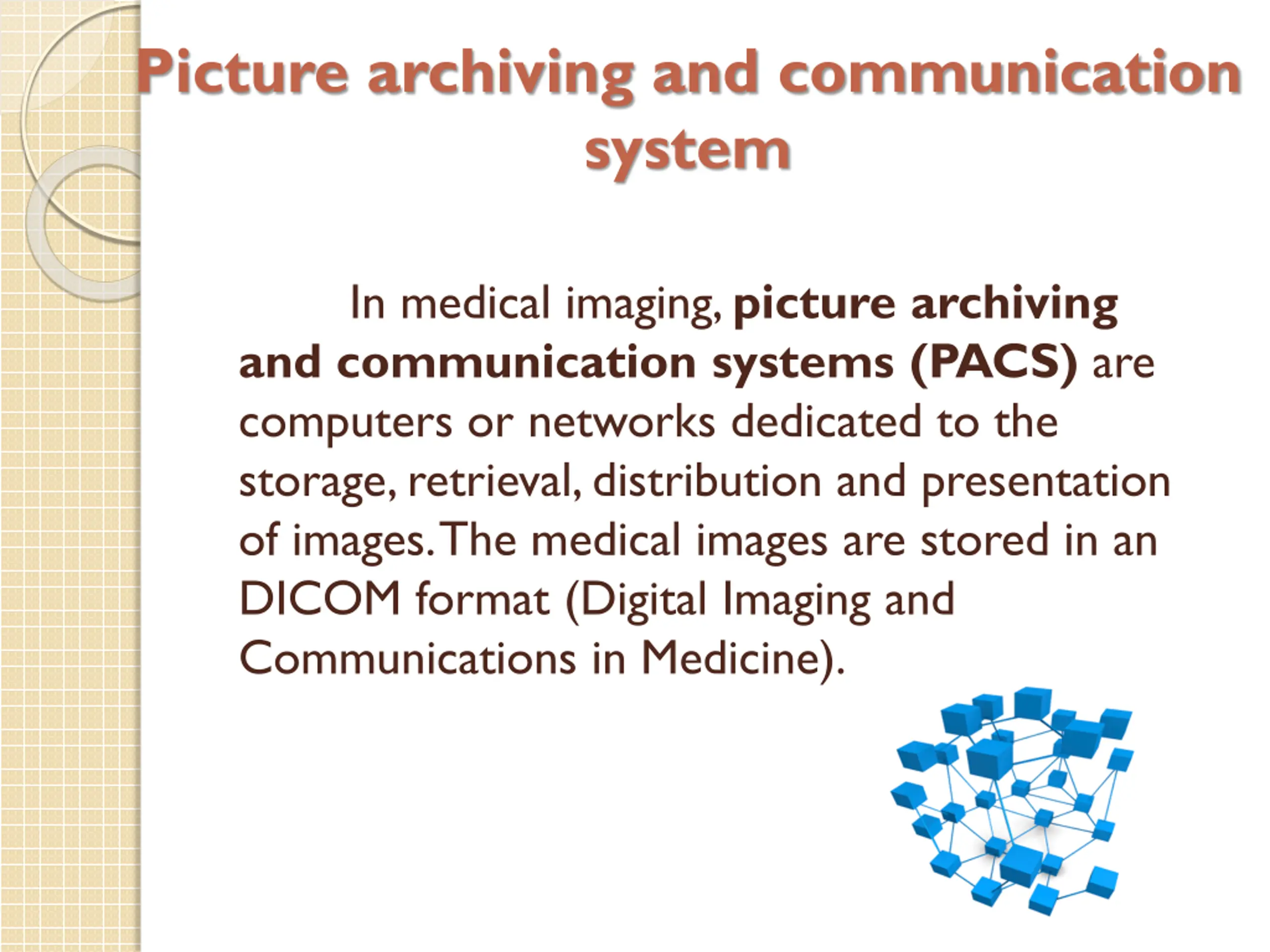 Picture archiving and communication system In medical imaging, picture archiving and communication systems (PACS) are computers or networks dedicated to the storage, retrieval, distribution and presentation of images. The medical images are stored in an DICOM format (Digital Imaging and Communications in Medicine).
