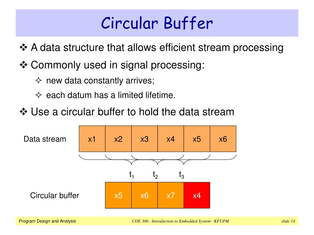 Circular Buffer A data structure that allows efficient stream processing Commonly used in signal processing: new data constantly arrives; each datum has a limited lifetime. Use a circular buffer to hold the data stream Data stream x1 x2 x3 x4 x5 x6 t1 t2 t3 Circular buffer x1 x5 x2 x6 x3 x7 x4 Program Design and Analysis COE 306 Introduction to Embedded System KFUPM slide 14