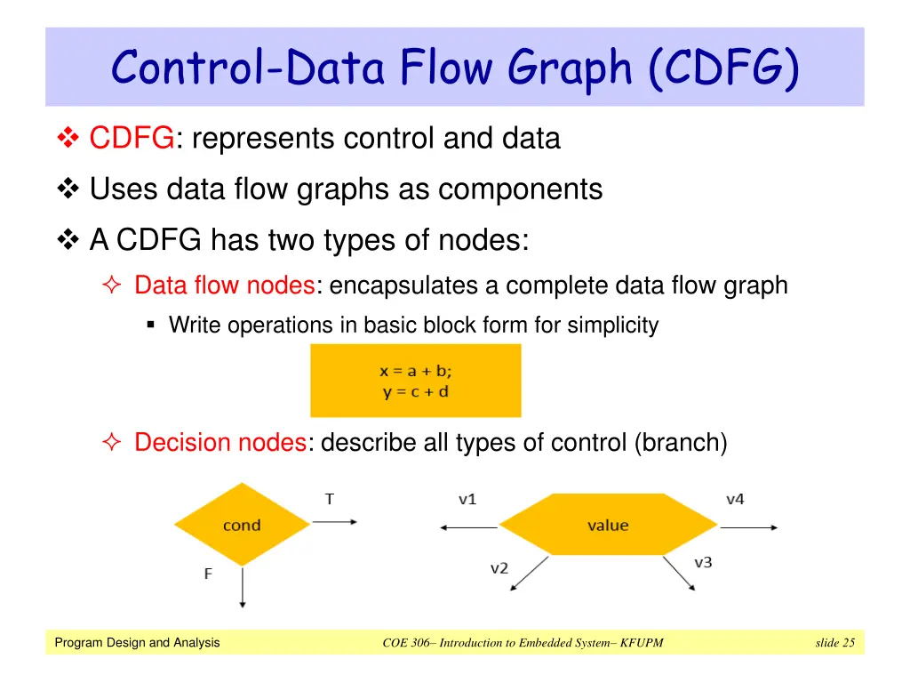 Control-Data Flow Graph (CDFG) CDFG: represents control and data Uses data flow graphs as components A CDFG has two types of nodes: Data flow nodes: encapsulates a complete data flow graph Write operations in basic block form for simplicity Decision nodes: describe all types of control (branch) Program Design and Analysis COE 306 Introduction to Embedded System KFUPM slide 25