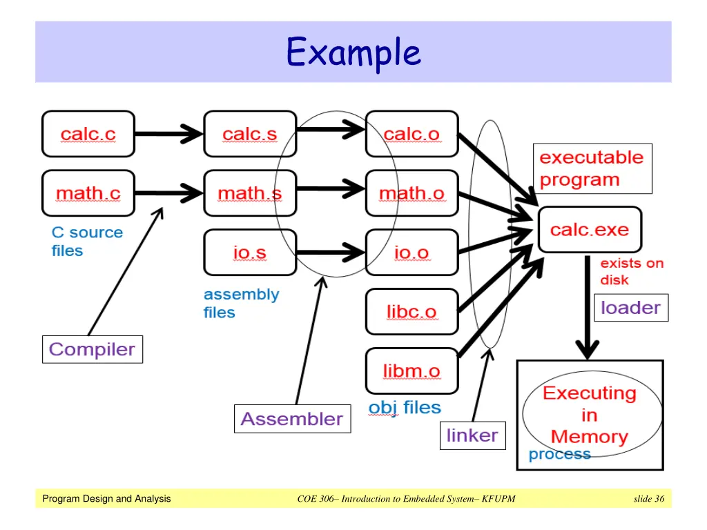 Loaders Loader reads executable from disk into memory Initializes registers, stack, arguments to first function Jumps to entry-point Part of the Operating System (OS) Program Design and Analysis COE 306 Introduction to Embedded System KFUPM slide 41