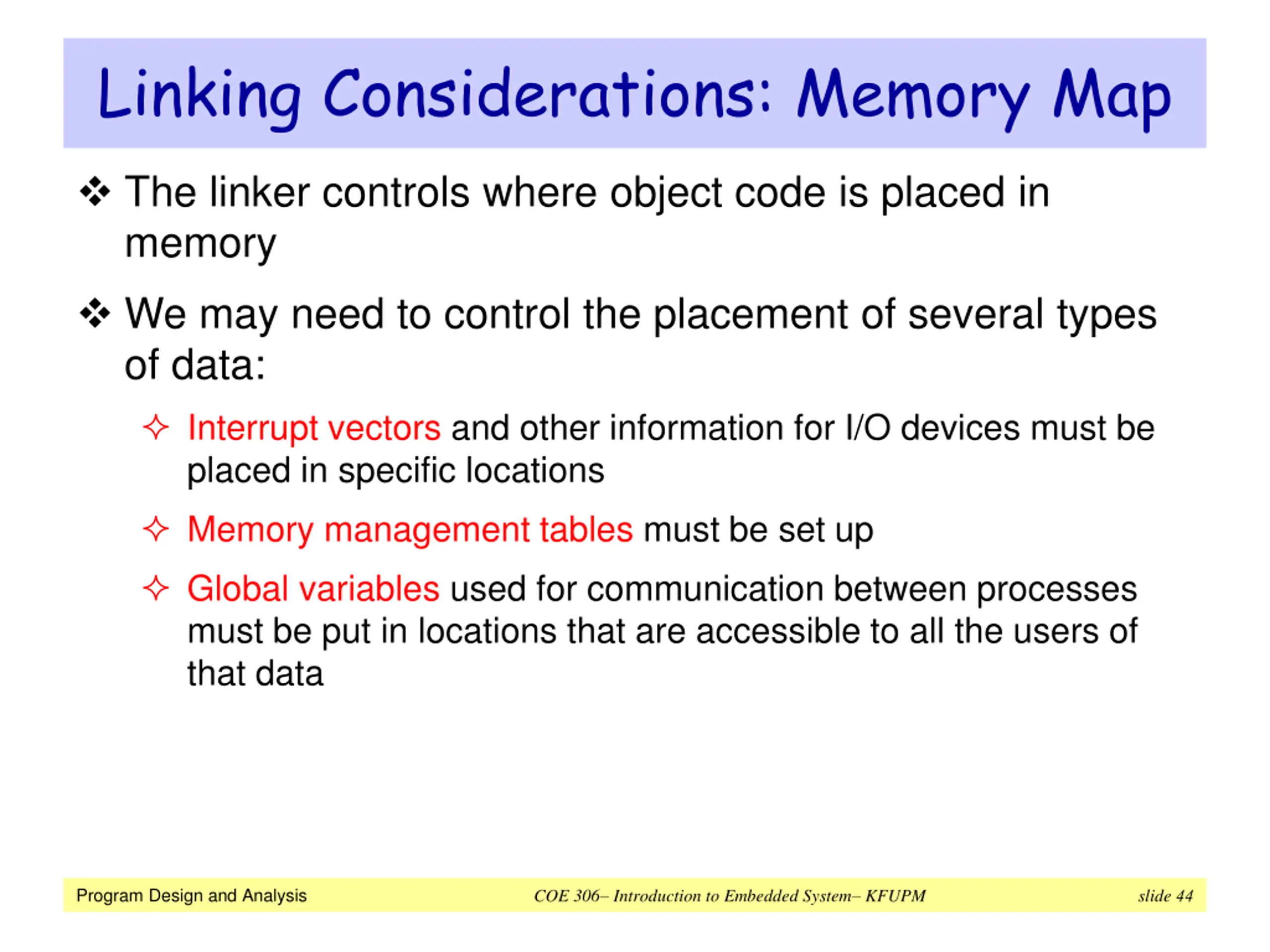 Linking Considerations: Memory Map The linker controls where object code is placed in memory We may need to control the placement of several types of data: Interrupt vectors and other information for I/O devices must be placed in specific locations Memory management tables must be set up Global variables used for communication between processes must be put in locations that are accessible to all the users of that data Program Design and Analysis COE 306 Introduction to Embedded System KFUPM slide 44
