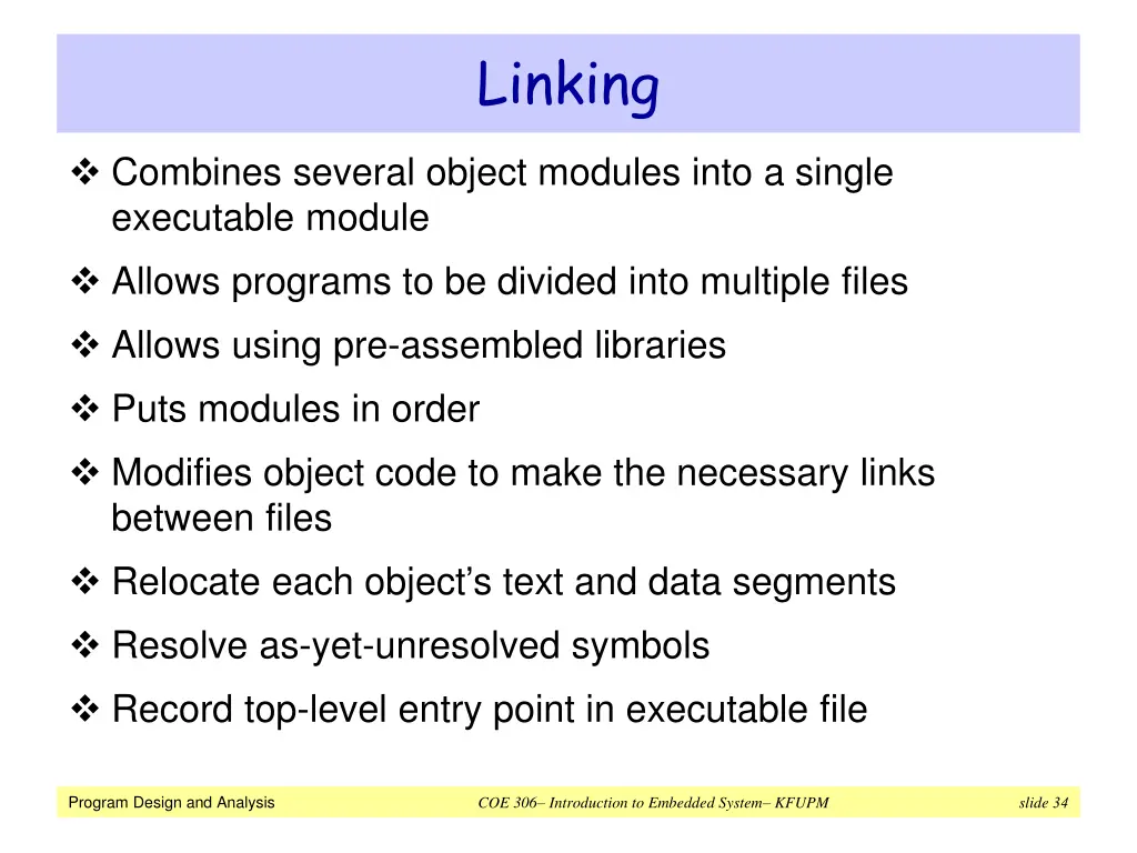 Object File Header location of main entry point (if any) size and position of pieces of file Text Segment: instructions Data Segment static data (local/global vars, strings, constants) Relocation Information Instructions and data that depend on actual addresses Linker patches these bits after relocating segments Symbol Table External (exported) references Unresolved (imported) references Program Design and Analysis COE 306 Introduction to Embedded System KFUPM slide 32