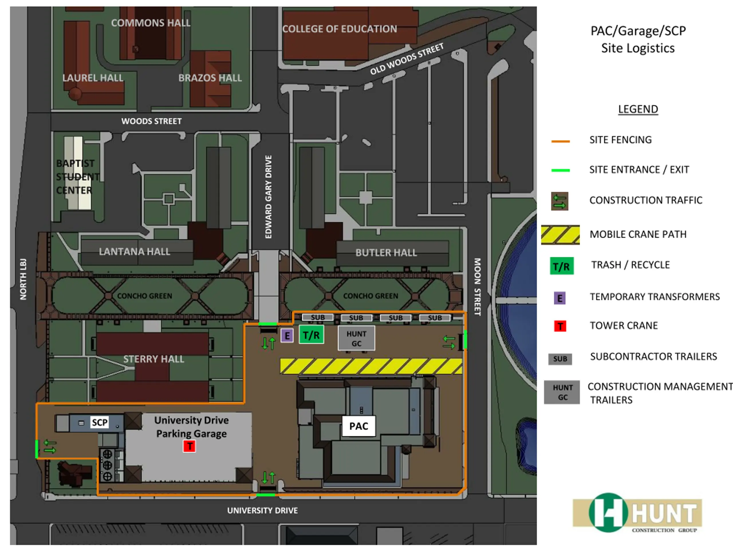 COMMONS HALL COLLEGE OF EDUCATION PAC/Garage/SCP Site Logistics LAUREL HALL BRAZOS HALL LEGEND WOODS STREET SITE FENCING EDWARD GARY DRIVE BAPTIST STUDENT CENTER SITE ENTRANCE / EXIT CONSTRUCTION TRAFFIC MOBILE CRANE PATH LANTANA HALL BUTLER HALL MOON STREET NORTH LBJ TRASH / RECYCLE T/R TEMPORARY TRANSFORMERS CONCHO GREEN CONCHO GREEN E SUB SUB SUB SUB TOWER CRANE T T/R HUNT GC E SUBCONTRACTOR TRAILERS STERRY HALL SUB CONSTRUCTION MANAGEMENT TRAILERS HUNT GC University Drive Parking Garage T SCP PAC UNIVERSITY DRIVE