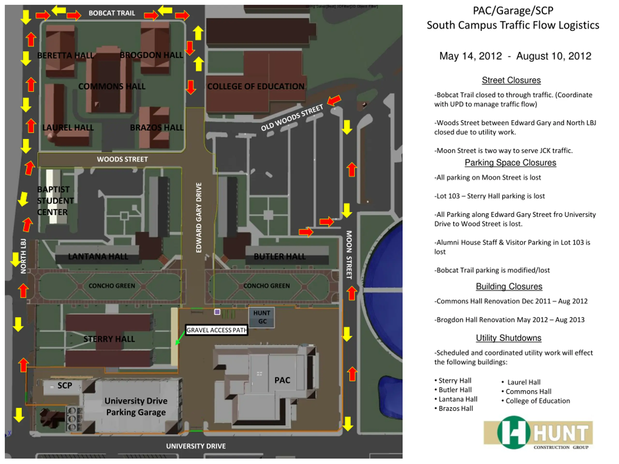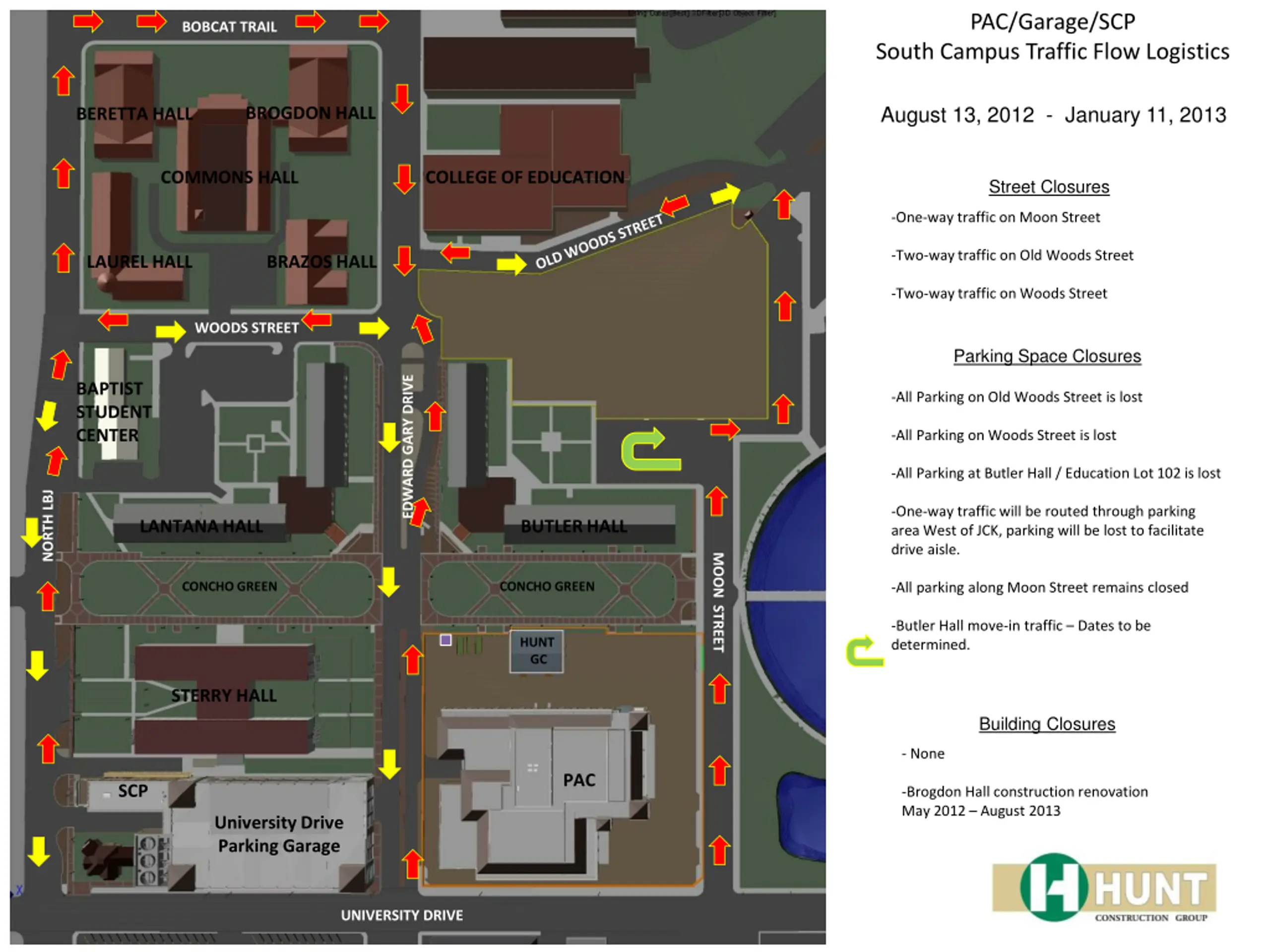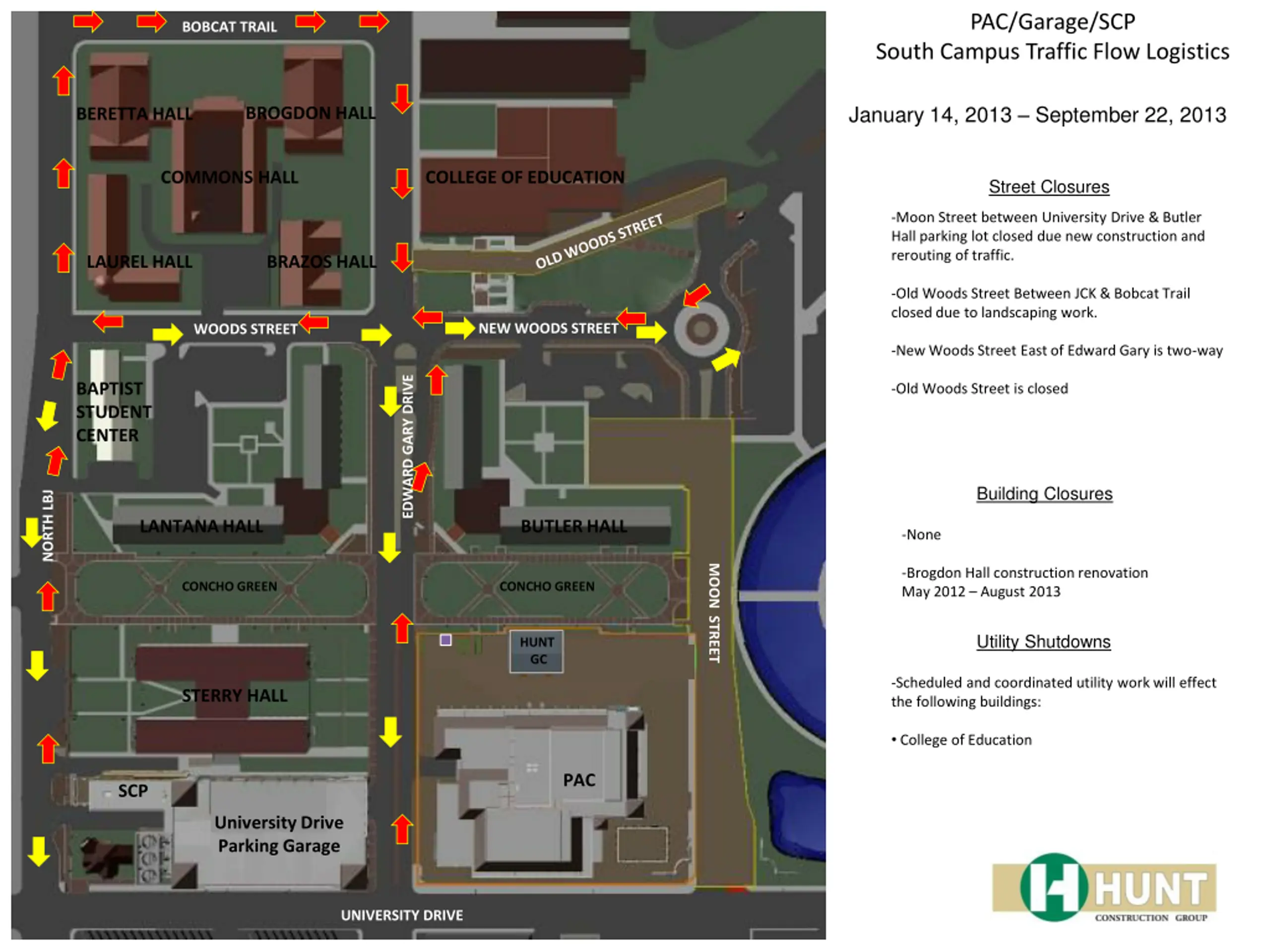 PAC/Garage/SCP BOBCAT TRAIL South Campus Traffic Flow Logistics January 14, 2013 September 22, 2013 BROGDON HALL BERETTA HALL COMMONS HALL COLLEGE OF EDUCATION Street Closures -Moon Street between University Drive & Butler Hall parking lot closed due new construction and rerouting of traffic. LAUREL HALL BRAZOS HALL -Old Woods Street Between JCK & Bobcat Trail closed due to landscaping work. NEW WOODS STREET WOODS STREET -New Woods Street East of Edward Gary is two-way EDWARD GARY DRIVE BAPTIST STUDENT CENTER -Old Woods Street is closed Building Closures NORTH LBJ LANTANA HALL BUTLER HALL -None MOON STREET -Brogdon Hall construction renovation May 2012 August 2013 CONCHO GREEN CONCHO GREEN Utility Shutdowns HUNT GC -Scheduled and coordinated utility work will effect the following buildings: STERRY HALL College of Education PAC SCP University Drive Parking Garage UNIVERSITY DRIVE