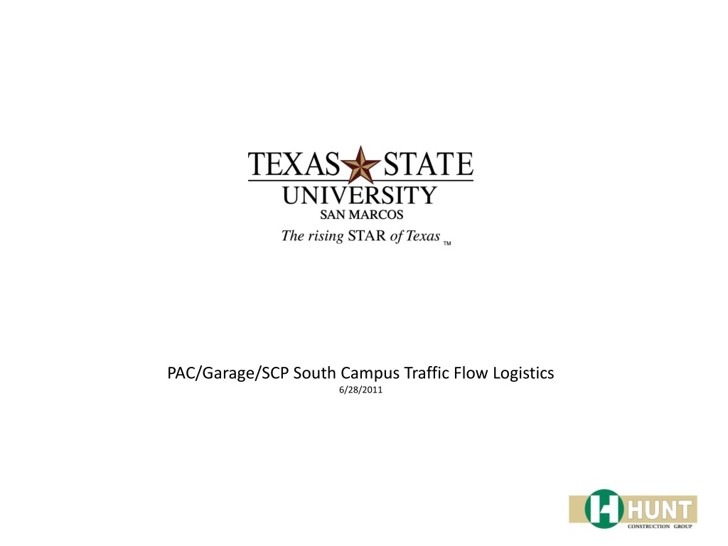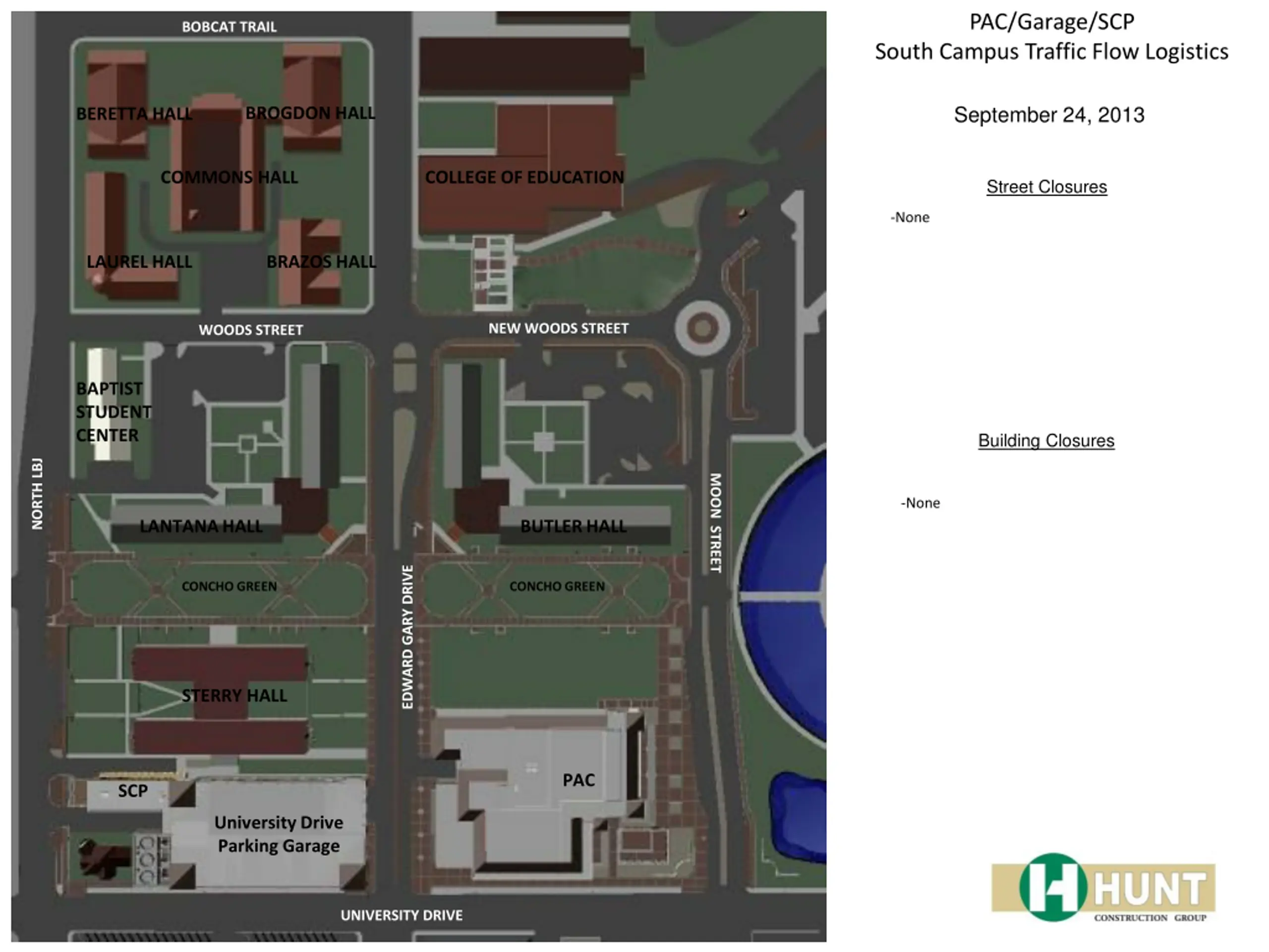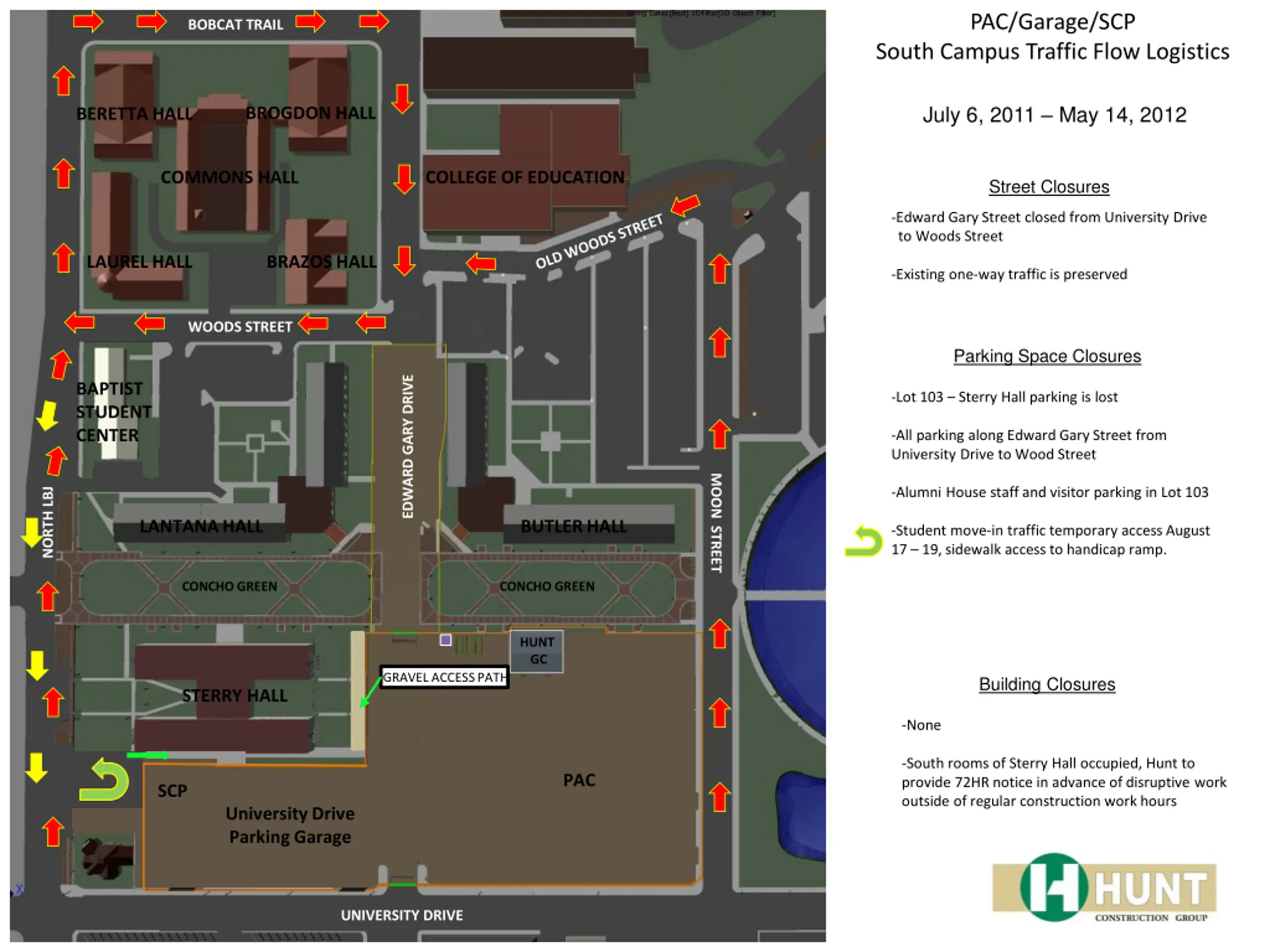 PAC/Garage/SCP BOBCAT TRAIL South Campus Traffic Flow Logistics September 24, 2013 BROGDON HALL BERETTA HALL COMMONS HALL COLLEGE OF EDUCATION Street Closures -None LAUREL HALL BRAZOS HALL NEW WOODS STREET WOODS STREET BAPTIST STUDENT CENTER Building Closures MOON STREET NORTH LBJ MOON STREET -None LANTANA HALL BUTLER HALL EDWARD GARY DRIVE CONCHO GREEN CONCHO GREEN STERRY HALL PAC SCP University Drive Parking Garage UNIVERSITY DRIVE