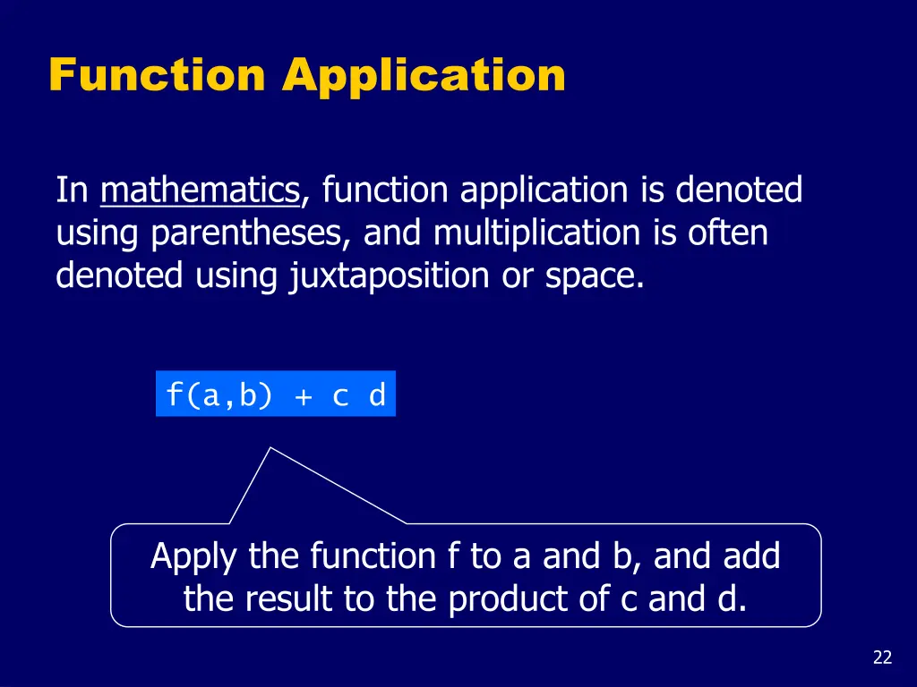 Function Application In mathematics, function application is denoted using parentheses, and multiplication is often denoted using juxtaposition or space. f(a,b) + c d Apply the function f to a and b, and add the result to the product of c and d. 22