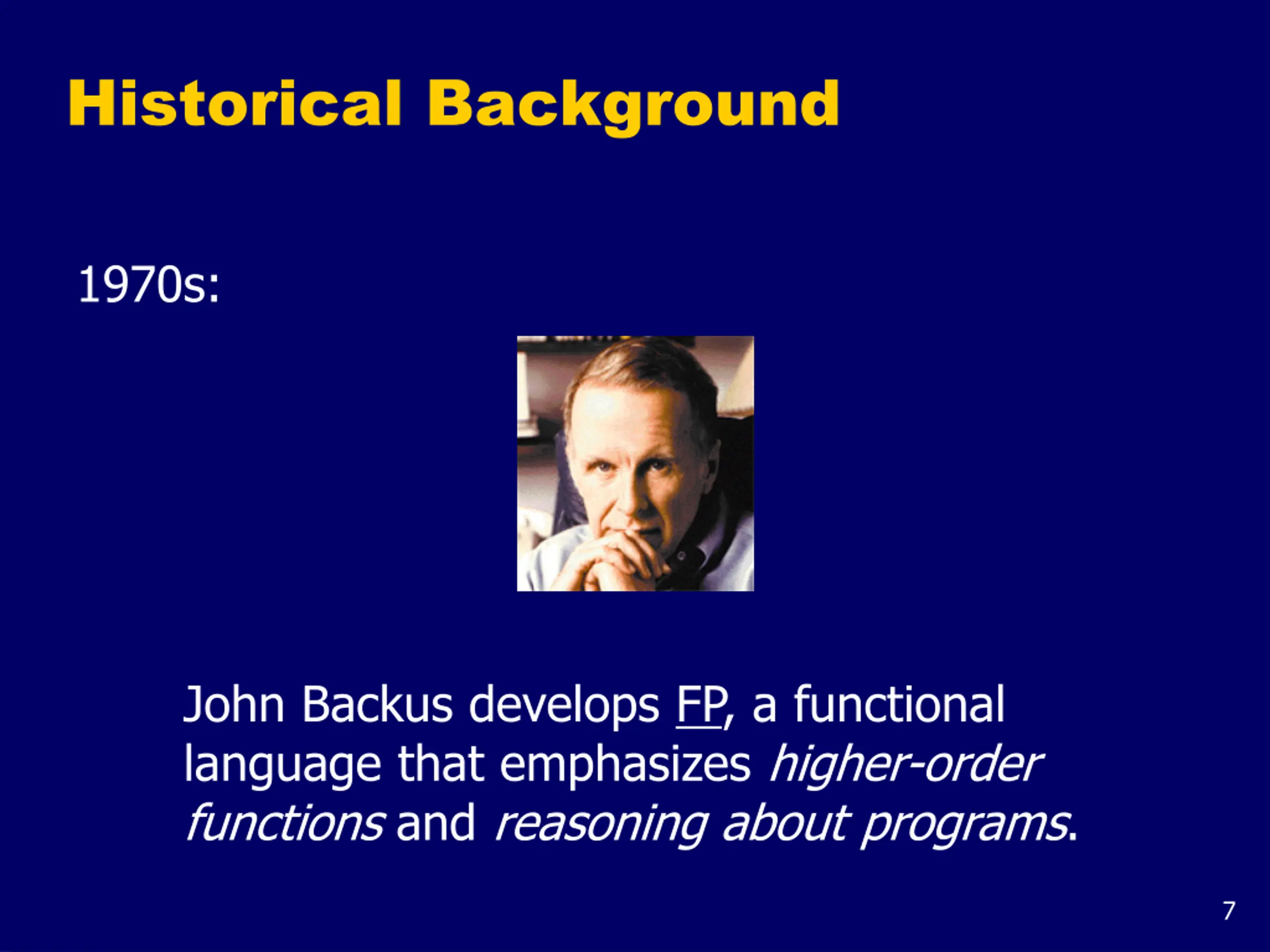 Historical Background 1970s: John Backus develops FP, a functional language that emphasizes higher-order functions and reasoning about programs. 7