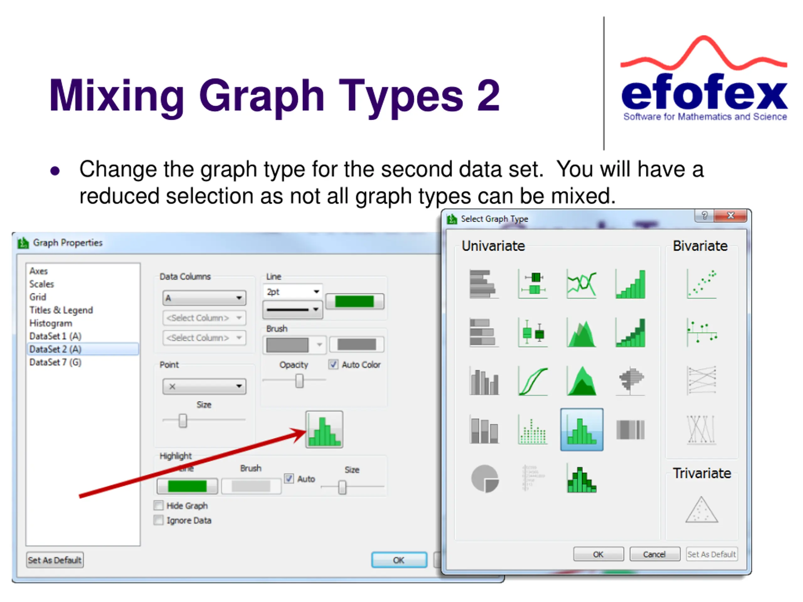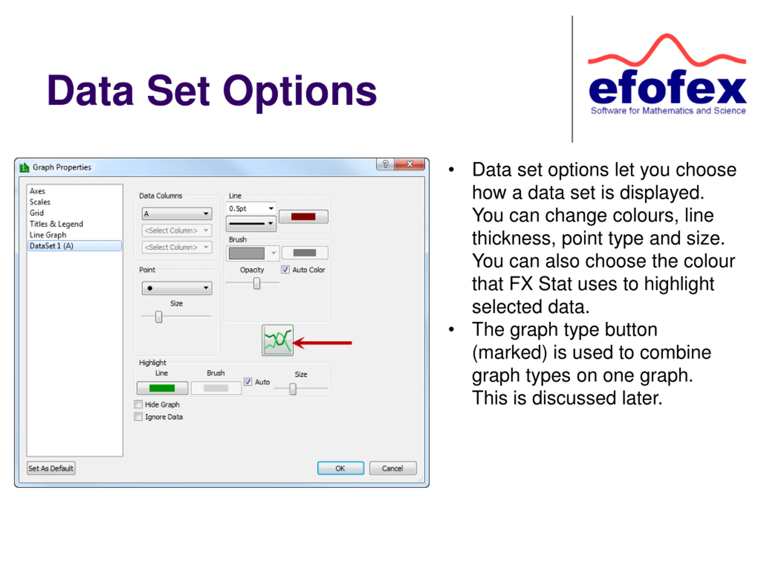 Data Set Options Data set options let you choose how a data set is displayed. You can change colours, line thickness, point type and size. You can also choose the colour that FX Stat uses to highlight selected data. The graph type button (marked) is used to combine graph types on one graph. This is discussed later.