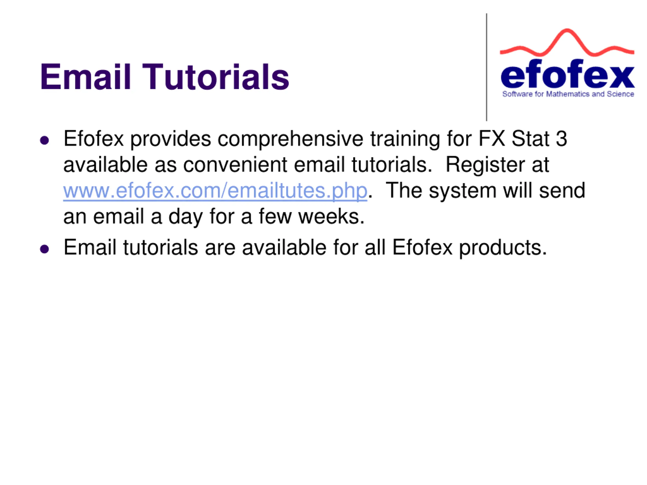 Email Tutorials Efofex provides comprehensive training for FX Stat 3 available as convenient email tutorials. Register at www.efofex.com/emailtutes.php. The system will send an email a day for a few weeks. Email tutorials are available for all Efofex products.