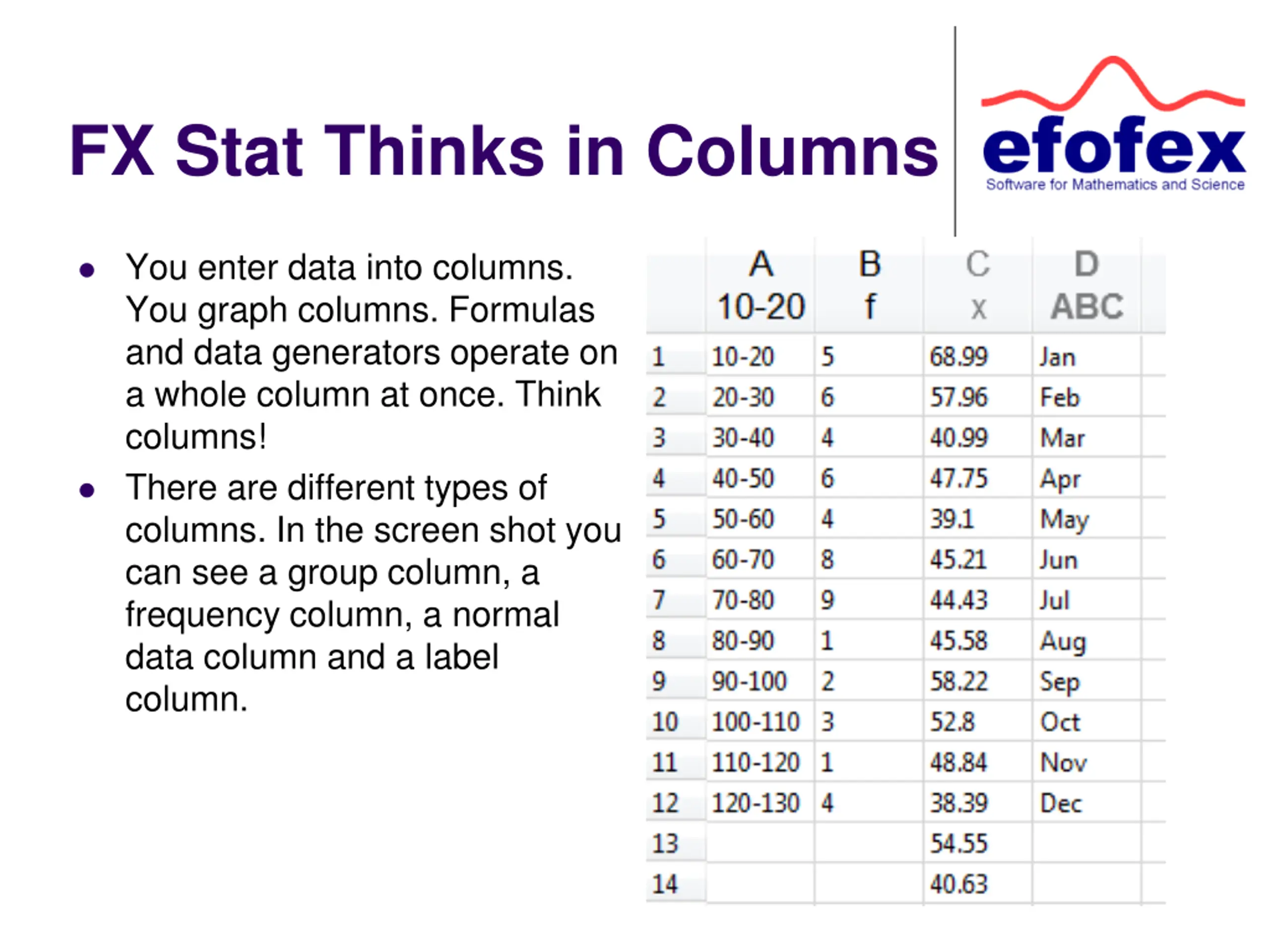 FX Stat Thinks in Columns You enter data into columns. You graph columns. Formulas and data generators operate on a whole column at once. Think columns! There are different types of columns. In the screen shot you can see a group column, a frequency column, a normal data column and a label column.