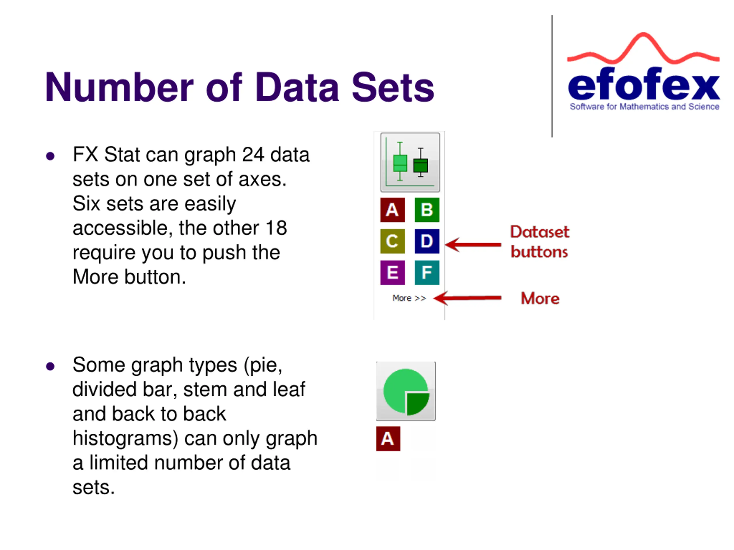 Number of Data Sets FX Stat can graph 24 data sets on one set of axes. Six sets are easily accessible, the other 18 require you to push the More button. Some graph types (pie, divided bar, stem and leaf and back to back histograms) can only graph a limited number of data sets.