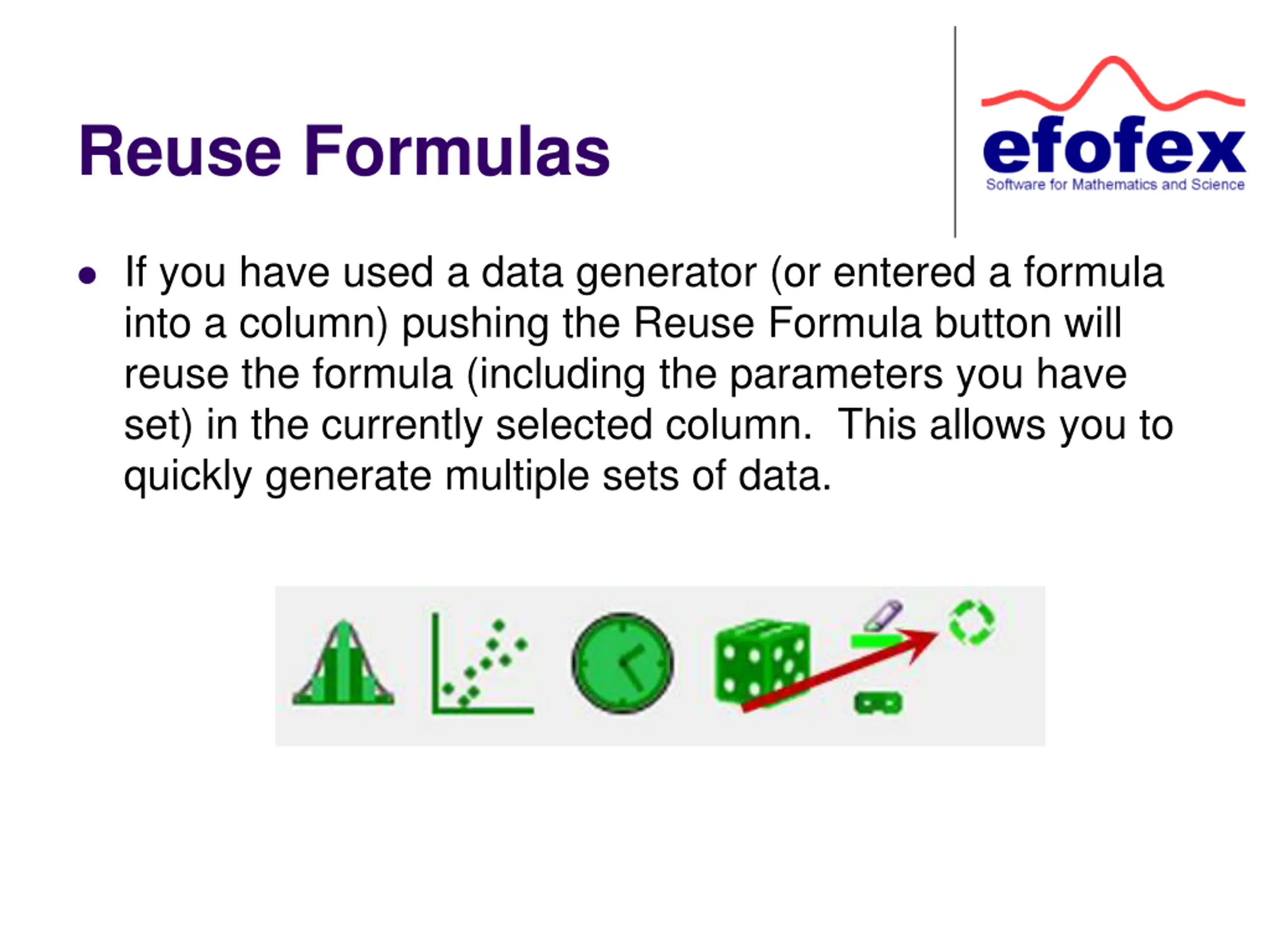 Reuse Formulas If you have used a data generator (or entered a formula into a column) pushing the Reuse Formula button will reuse the formula (including the parameters you have set) in the currently selected column. This allows you to quickly generate multiple sets of data.