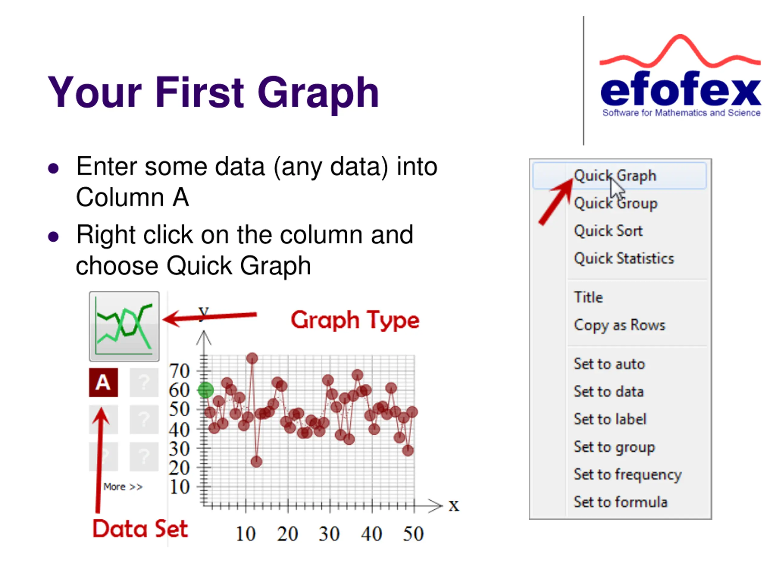 Your First Graph Enter some data (any data) into Column A Right click on the column and choose Quick Graph