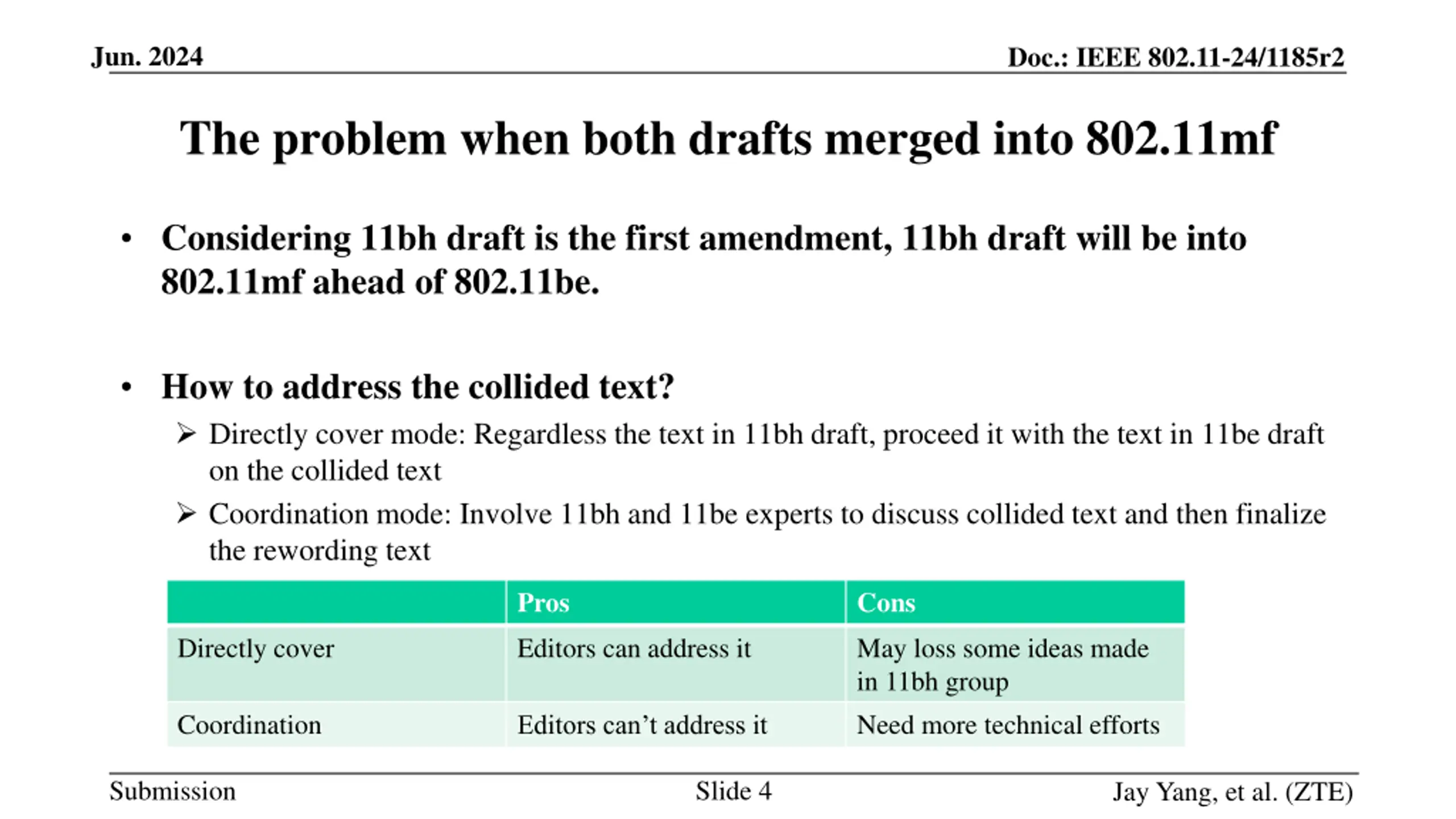 Jun. 2024 Doc.: IEEE 802.11-24/1185r2 The problem when both drafts merged into 802.11mf Considering 11bh draft is the first amendment, 11bh draft will be into 802.11mf ahead of 802.11be. How to address the collided text? Directly cover mode: Regardless the text in 11bh draft, proceed it with the text in 11be draft on the collided text Coordination mode: Involve 11bh and 11be experts to discuss collided text and then finalize the rewording text Pros Cons Directly cover Editors can address it May loss some ideas made in 11bh group Need more technical efforts Coordination Editors can t address it Submission Slide 4 Jay Yang, et al. (ZTE)