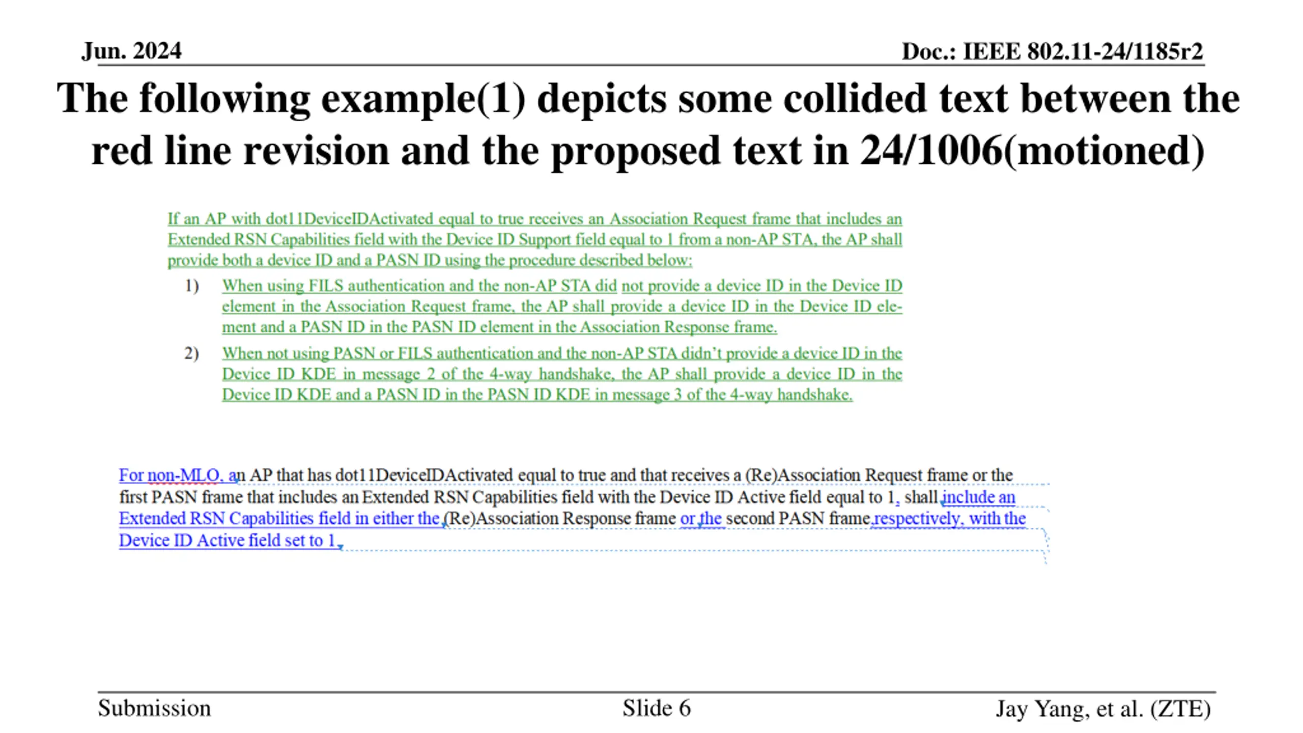 Jun. 2024 The following example(1) depicts some collided text between the red line revision and the proposed text in 24/1006(motioned) Doc.: IEEE 802.11-24/1185r2 Submission Slide 6 Jay Yang, et al. (ZTE)