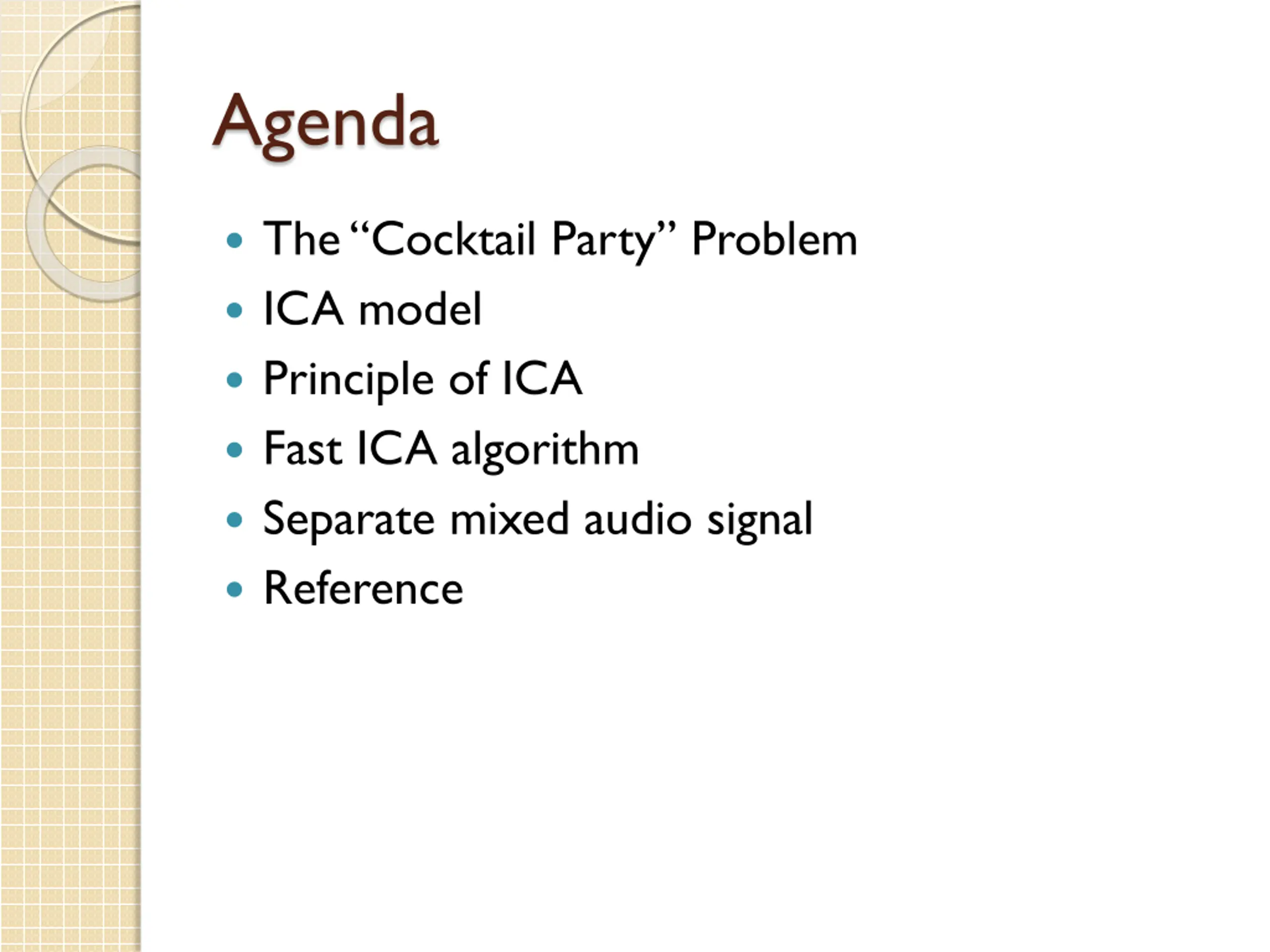 Agenda The Cocktail Party Problem ICA model Principle of ICA Fast ICA algorithm Separate mixed audio signal Reference