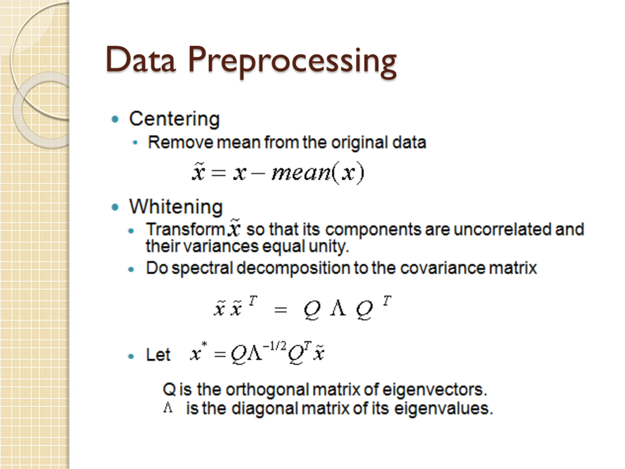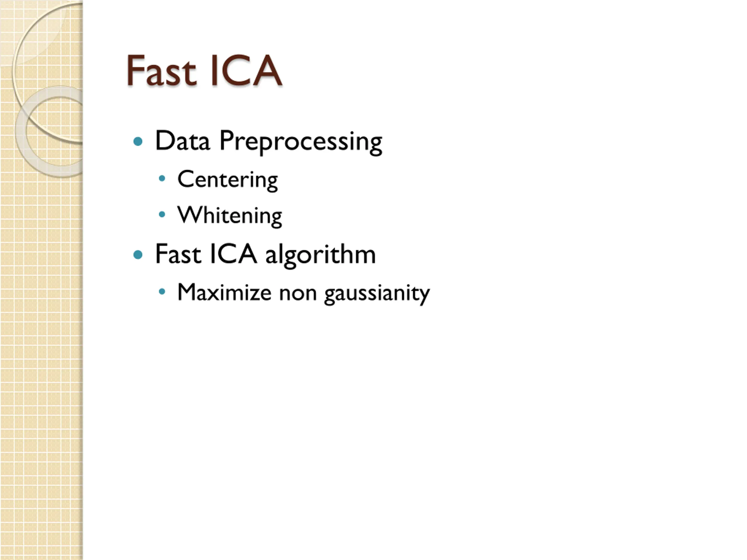 Fast ICA Data Preprocessing Centering Whitening Fast ICA algorithm Maximize non gaussianity
